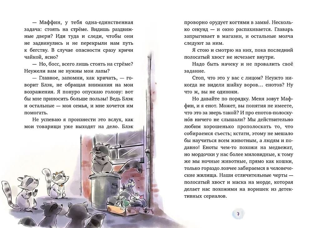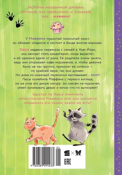 У Маффина пушистый полосатый хвост, он обожает сладости и состоит в банде енотов- воришек.