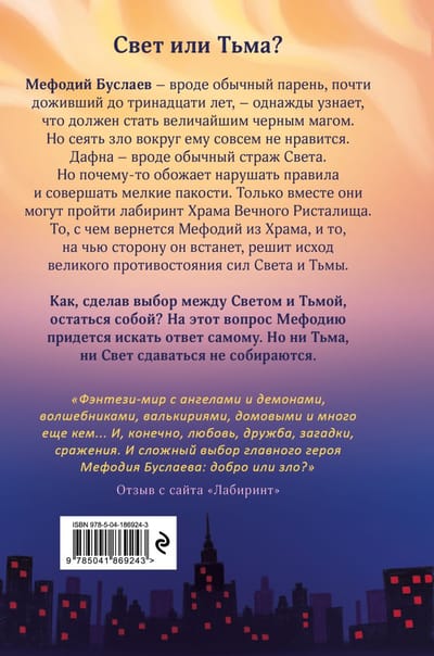 Как, сделав выбор между Светом и Тьмой, остаться собой? Это самый важный вопрос, который гложет Мефодия Буслаева. Меф — вроде обычный парень — однажды узнаёт, что должен стать величайшим чёрным магом. Но сеять зло ему совсем не нравится. Дафна — вроде обычный страж Света. Но почему-то обожает нарушать правила и совершать мелкие пакости.
