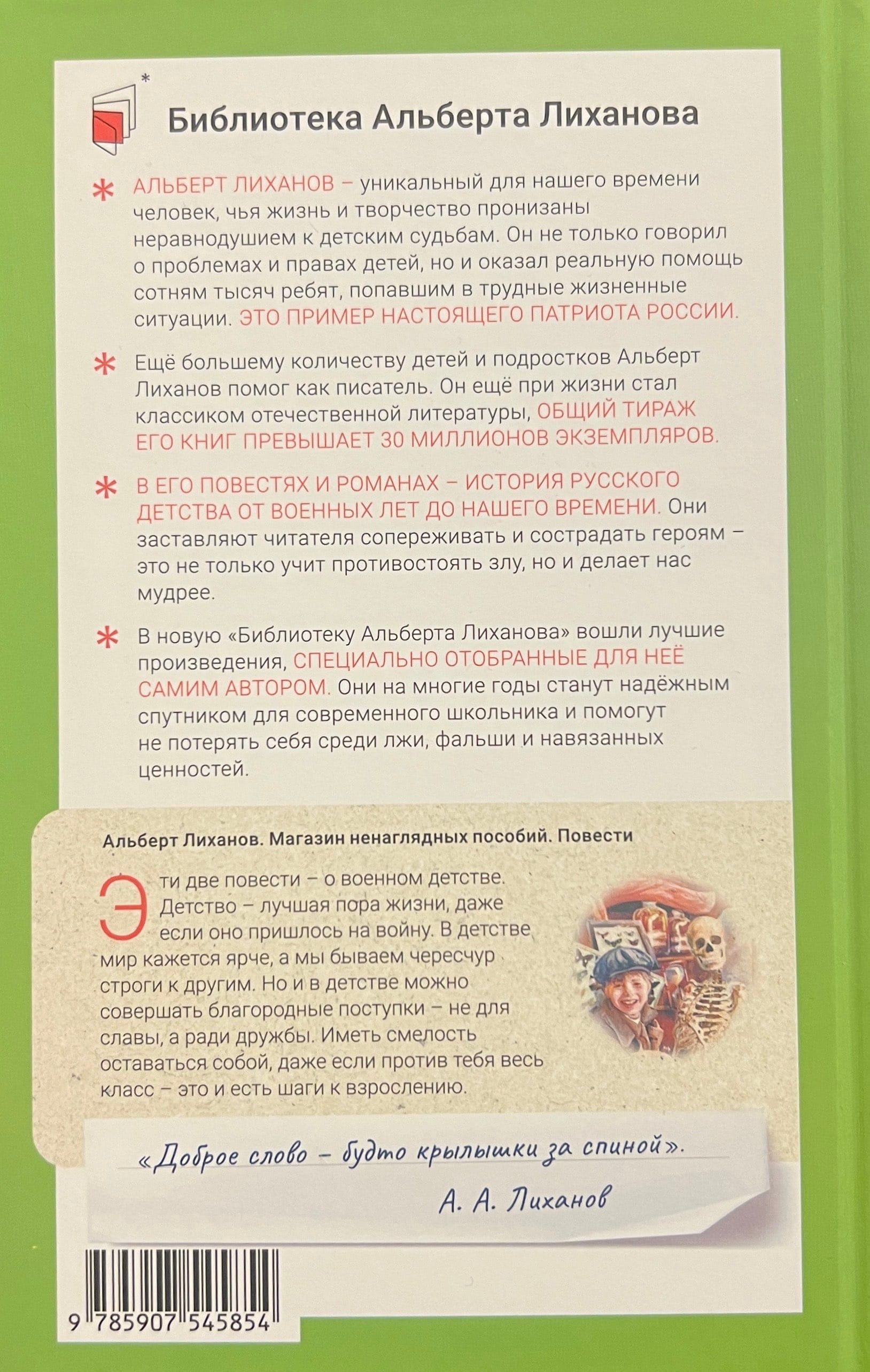 Альберт Анатольевич Лиханов (1935–2021) — известный российский писатель и общественный деятель, основатель Российского детского фонда, более 30 лет отдавший служению детству. Его книги широко известны не только в России, но и во многих странах мира. Все они пронизаны неравнодушием к детским судьбам. Продолжая традиции русских писателей-классиков, он своими произведениями взращивает в душах людей добро и учит противостоять злу. Повести «Магазин ненаглядных пособий» и «Детская библиотека», как и многие произведения А. А. Лиханова, посвящены военному детству.