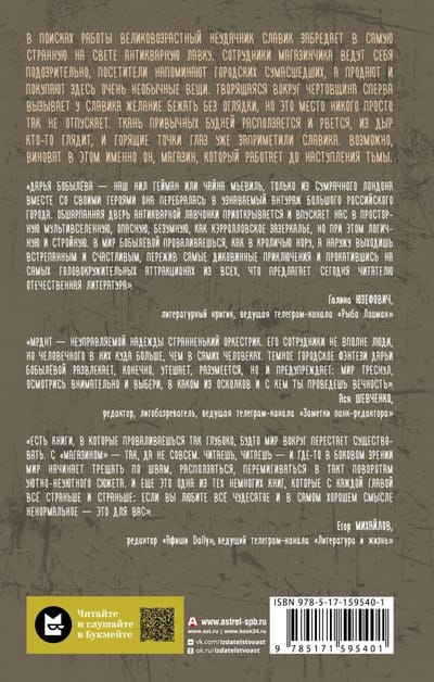 В поисках работы великовозрастный неудачник Славик забредает в самую странную на свете антикварную лавку. Сотрудники магазинчика ведут себя подозрительно, посетители напоминают городских сумасшедших, а продают и покупают здесь очень необычные вещи. Творящаяся вокруг чертовщина сперва вызывает у Славика желание бежать без оглядки, но это место никого просто так не отпускает. Ткань привычных будней расползается и рвется, из дыр кто-то глядит, и горящие точки глаз уже заприметили Славика. Возможно, виноват в этом именно он, магазин, который работает до наступления тьмы.