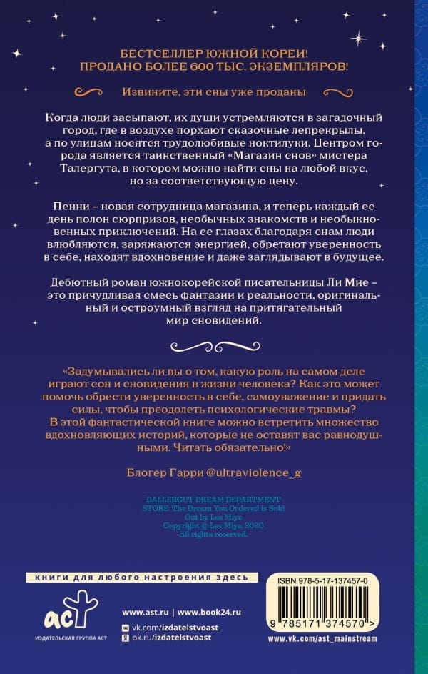 Когда люди засыпают, их души устремляются в загадочный город, где в воздухе порхают сказочные лепрекрылы, а по улицам носятся трудолюбивые ноктилуки. Центром города является таинственный «Магазин снов» мистера Талергута, в котором можно найти сны на любой вкус, но за соответствующую цену. Пенни — новая сотрудница магазина, и теперь каждый ее день полон сюрпризов, необычных знакомств и необыкновенных приключений. На ее глазах благодаря снам люди влюбляются, заряжаются энергией, обретают уверенность в себе, находят вдохновение и даже заглядывают в будущее. Дебютный роман южнокорейской писательницы Ли Мие — это причудливая смесь фантазии и реальности, оригинальный и остроумный взгляд на притягательный мир сновидений.