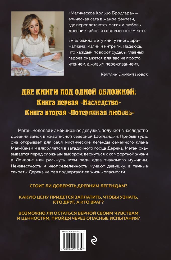 «Магическое Кольцо Бродгара» — эпическая сага, в которой переплетаются магия и любовь, древние тайны и современные мечты. Мэган Мак-Кензи, молодая и амбициозная девушка, получает в наследство древний замок в живописной Северной Шотландии. Прибыв туда, она открывает для себя мистические легенды семейного клана Мак-Кензи и влюбляется в загадочного горца Дерека. Мэган оказывается перед сложным выбором: вернуться к комфортной жизни в Лондоне или рискнуть всем ради едва знакомого мужчины. Неизвестность и неопределенность мучают девушку, а темные секреты Дерека не раз подвергают ее жизнь опасности.