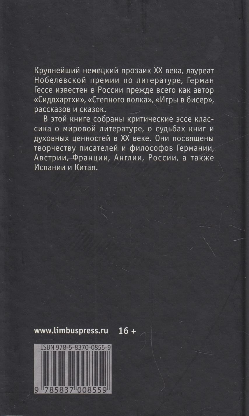 Крупнейший немецкий прозаик XX века, лауреат Нобелевской премии по литературе, Герман Гессе известен в России прежде всего как автор «Сиддхартхи», «Степного волка», «Игры в бисер», рассказов и сказок. В этой книге собраны критические эссе классика о мировой литературе, о судьбах книг и духовных ценностей в ХХ веке. Они посвящены творчеству писателей и философов Германии, Австрии, Франции, Англии, России, а также Испании и Китая.