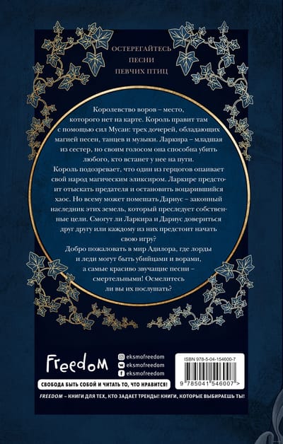 Королевство воров — место, которого нет на карте. Король правит там с помощью сил Мусаи: трех дочерей, обладающих магией песен, танцев и музыки. Ларкира — младшая из сестер, но своим голосом она способна убить любого, кто встанет у нее на пути. Король подозревает, что один из герцогов опаивает свой народ магическим эликсиром. Ларкире предстоит отыскать предателя и остановить воцарившийся хаос. Но всему может помешать Дариус — законный наследник этих земель, который преследует собственные цели. Смогут ли Ларкира и Дариус довериться друг другу, или каждому из них предстоит начать свою игру? Добро пожаловать в мир Адилора, где лорды и леди могут быть убийцами и ворами, а самые красиво звучащие песни — смертельными! Осмелитесь ли вы их послушать?