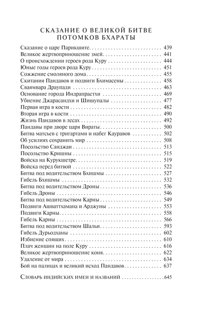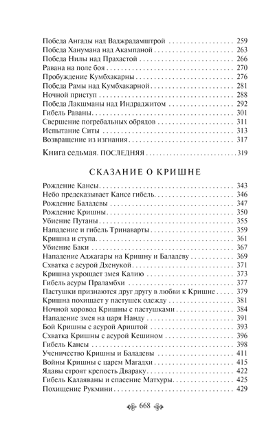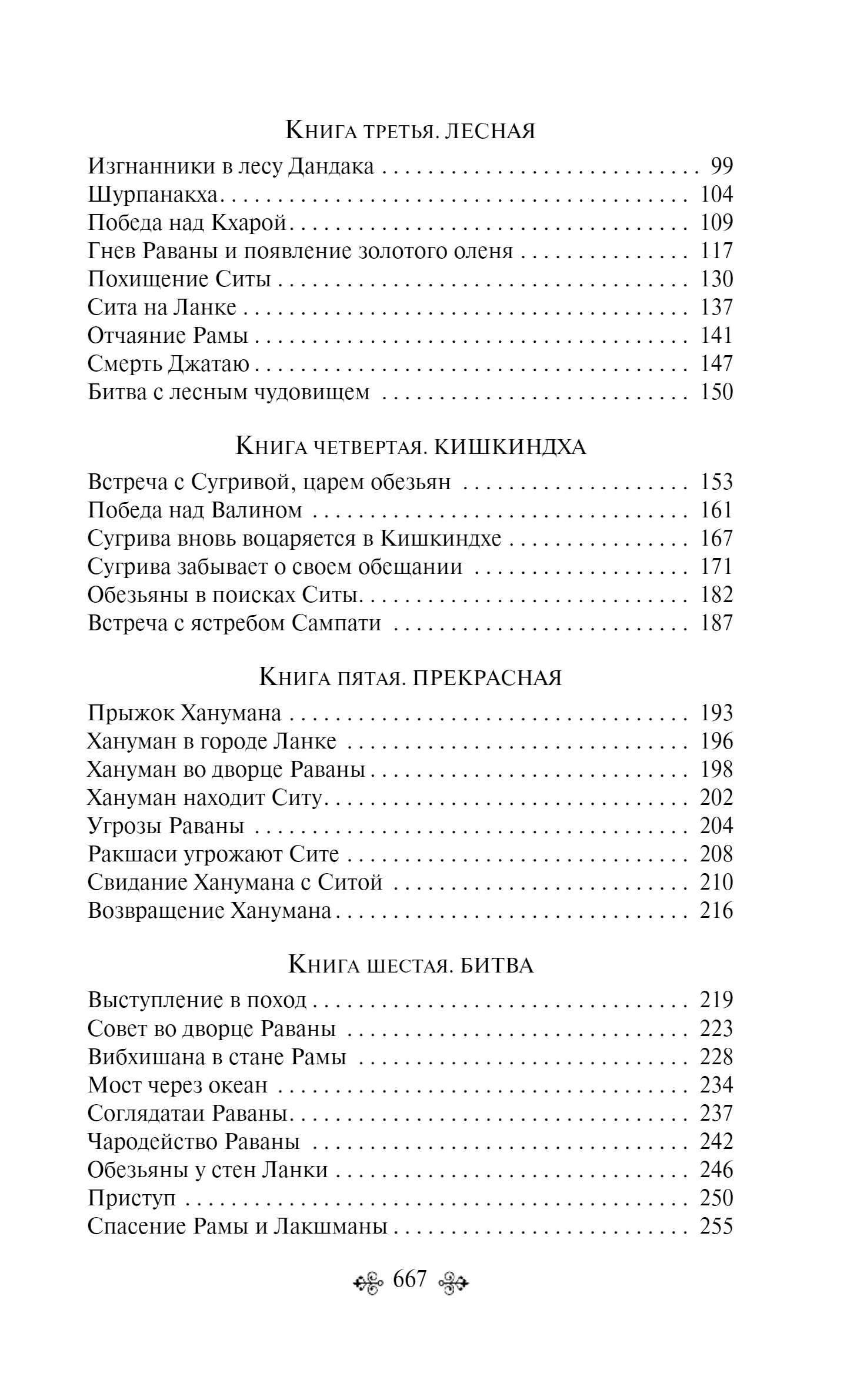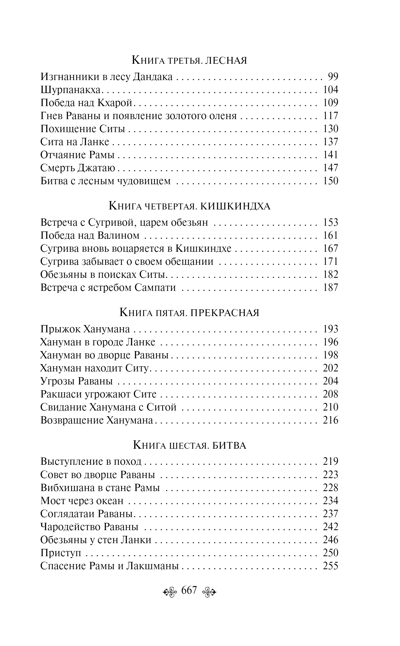 Книга начинается со «Сказания о Раме» — захватывающей истории о похищении прекрасной Ситы ужасным Раваной, повелителем ракшасов. Рама вместе с войском обезьян отправляется на поиски возлюбленной, преодолевая различные препятствия, возникающие на их пути.