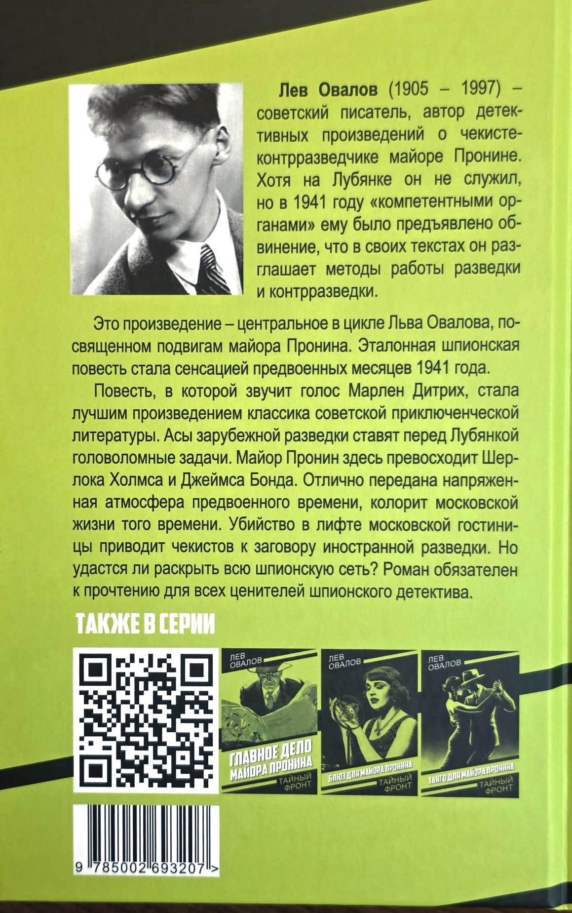 «Голубой ангел» – центральное произведение в цикле Льва Овалова, посвященном подвигам майора Пронина. Эталонная шпионская история явилась главной литературной сенсацией предвоенных месяцев 1941 года. Повесть, в которой звучит голос Марлен Дитрих, стала одним из лучших произведений классика советской приключенческой литературы. Асы зарубежной разведки ставят перед Лубянкой головоломные задачи. Майор Пронин здесь превосходит Шерлока Холмса и Джеймса Бонда. Достоверно передана напряженная атмосфера предвоенных дней, колорит московской жизни того времени. Убийство в лифте московской гостиницы приводит чекистов к заговору иностранной разведки. Но удастся ли раскрыть всю шпионскую сеть? Повесть рекомендуется к прочтению для всех ценителей шпионского детектива. В сборник включены рассказы, героем которых также выступает майор Пронин.