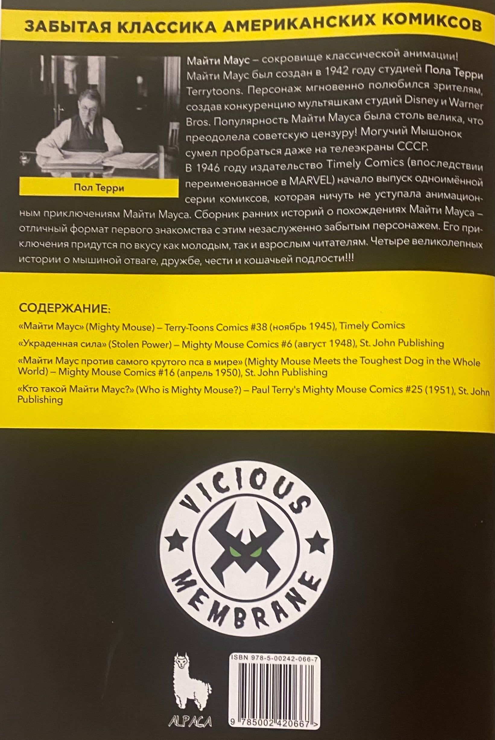 Сборник ранних историй о похождениях Майти Мауса — отличный формат первого знакомства с этим незаслуженно забытым персонажем. Его приключения придутся по вкусу как молодым, так и взрослым читателям. Четыре великолепных истории о мышиной отваге, дружбе, чести и кошачьей подлости!