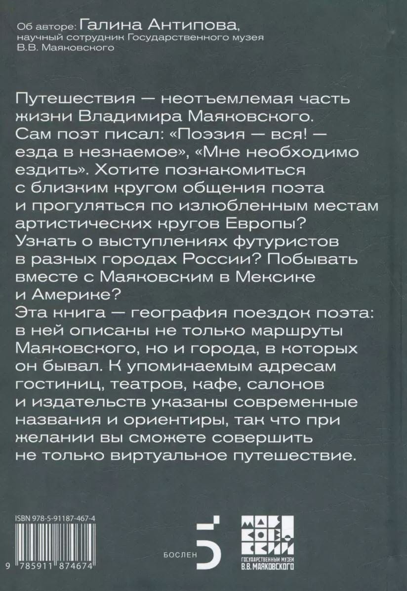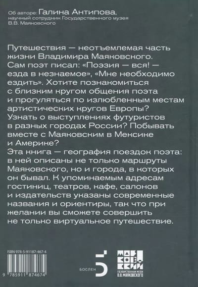 Путешествия — неотъемлемая часть жизни Владимира Маяковского. Сам поэт писал: «Поэзия — вся! — езда в незнакомое», «Мне необходимо ездить». В поездках происходили важнейшие события, впечатления от них откладывались в стихах и других произведениях. Хотите познакомиться с близким кругом общения поэта и прогуляться по излюбленным местам артистических кругов Европы? Узнать о выступлениях футуристов в разных городах России? Побывать вместе с Маяковским в Мексике и Америке? Эта книга — география поездок поэта: в ней описаны не только маршруты Маяковского, но и города, в которых он бывал. К упоминаемым адресам гостиниц, театров, кафе, салонов и издательств указаны современные названия и ориентиры, так что при желании вы сможете совершить не только виртуальное путешествие. QR-коды ведут на дополнительные материалы и карты городов, где поэт или был неоднократно, или они сыграли значительную роль в его биографии и творчестве. Текст сопровождает множество иллюстраций — фотографии, портреты героев, трогательные, а чаще обескураживающие записки публики, открытки, афиши — все это воссоздает бурную творческую атмосферу начала ХХ века.