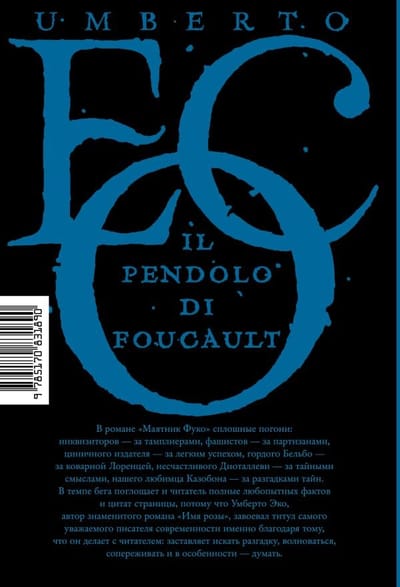 После выхода мирового бестселлера "Имя розы" (1980), прославленного знаменитым фильмом, итальянский историк, эстетик, структуралист Умберто Эко оказался в трудном положении. Как второй раз взять подобную высоту? Как сочинить не менее удачную книгу для разных читателей, и эрудированных и неискушенных? Книгу столь же живую, сколь и мудрую, столь же сардоничную, сколько и нежную? Автор рискнул - и подтвердил прежний рекорд. "Маятник Фуко" (1988) прославился не меньше "Имени розы", а фильм по нему не сняли только оттого, что автор сам не разрешил это великому Стенли Кубрику. На этих страницах взаимодействуют редакторы миланского издательства, рыцари-храмовники, жрецы вуду и антифашисты-партизаны. Рассказано и о легендарных тамплиерах, о тайных хозяевах мира, но только чтоб напомнить: история достоверна тогда, когда ее основа - неоспоримый документ. Все остальное - игра. Игра, которая бывает опасной.