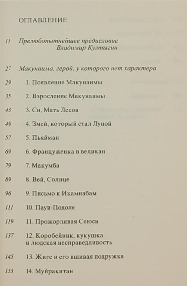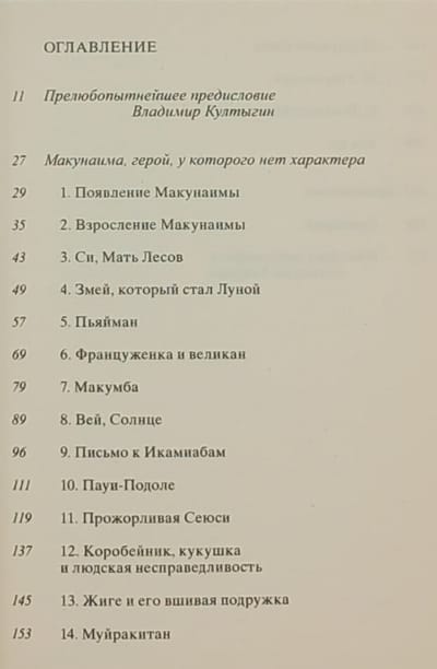Главный герой романа Макунаима, представитель амазонского племени тапаньюмас, бродит по свету в поисках муйракитана — амулета, который подарила ему Си, Мать Лесов. Эти поиски то и дело прерываются разнообразными происшествиями, отражающими мифы и легенды Бразилии. В книге сочетаются различные диалекты, фольклор, антропология и мифология, синтезирующие бразильскую идентичность. Однако присутствует и язвительная критика «бразильскости». Макунаима — лентяй, его заботят только чувственные удовольствия; он одновременно и индеец, и чернокожий, и белый; всё это — метафора народа, который только-только формируется, а потому у него «нет характера». Тем не менее персонаж Макунаимы позволил Андради сделать то, к чему так стремился бразильский модернизм, — установить понимающий, внимательный диалог между «высокой» и народной культурой. Настоящее издание включает в себя подробный глоссарий и «Манифест антропофага» Освалда ди Андради.