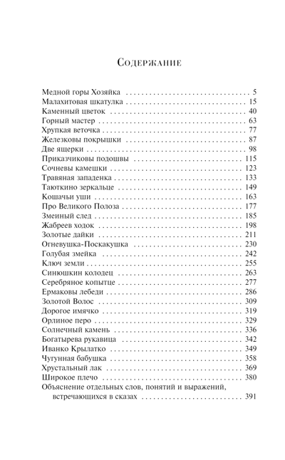 В него вошли «Медной горы Хозяйка», «Малахитовая шкатулка», «Каменный цветок», «Горный мастер», «Две ящерки», «Огневушка-Поскакушка», «Серебряное копытце» и другие.