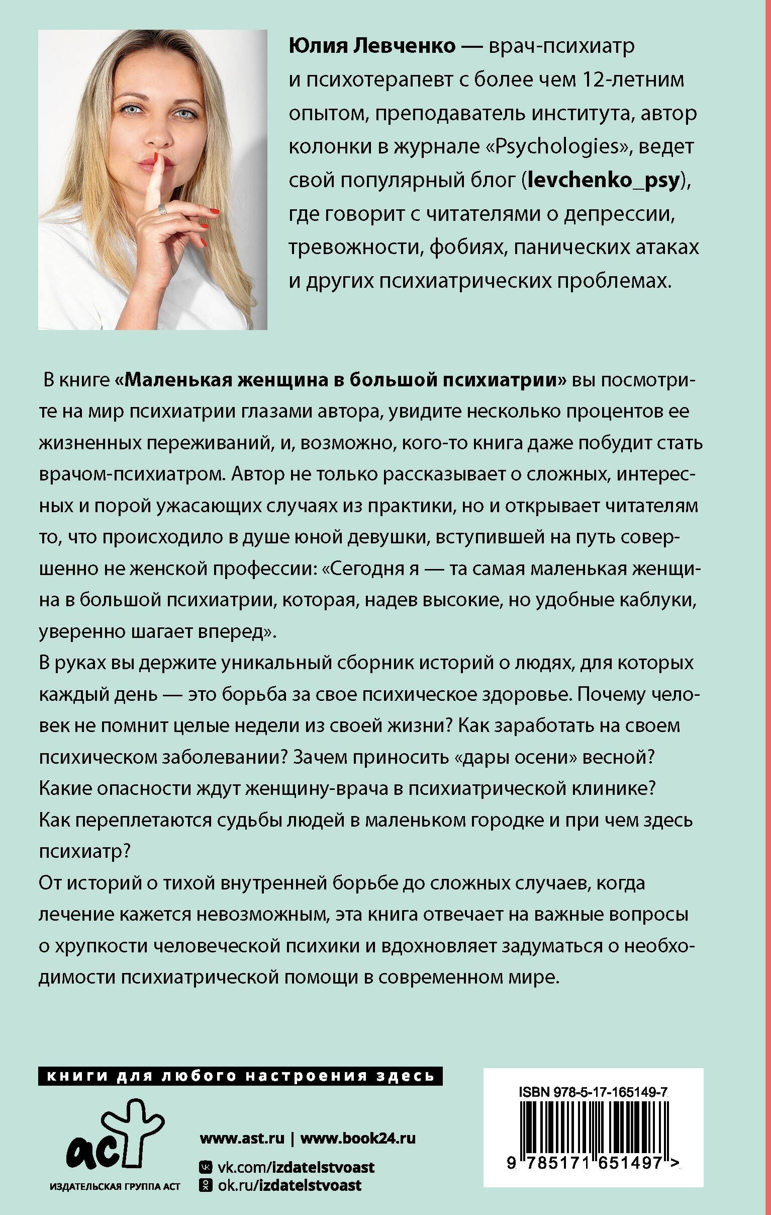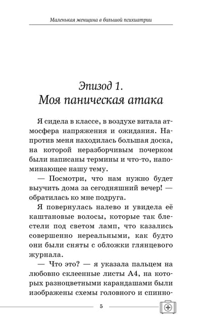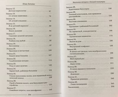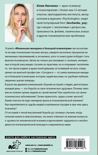В книге «Маленькая женщина в большой психиатрии» вы посмотрите на мир психиатрии глазами автора, увидите несколько процентов ее жизненных переживаний, и, возможно, кого-то книга даже побудит стать врачом-психиатром. Автор не только рассказывает о сложных, интересных и порой ужасающих случаях из практики, но и открывает читателям то, что происходило в душе юной девушки, вступившей на путь совершенно неженской профессии: «Сегодня я — та самая маленькая женщина в большой психиатрии, которая, надев высокие, но удобные каблуки, уверенно шагает вперед».