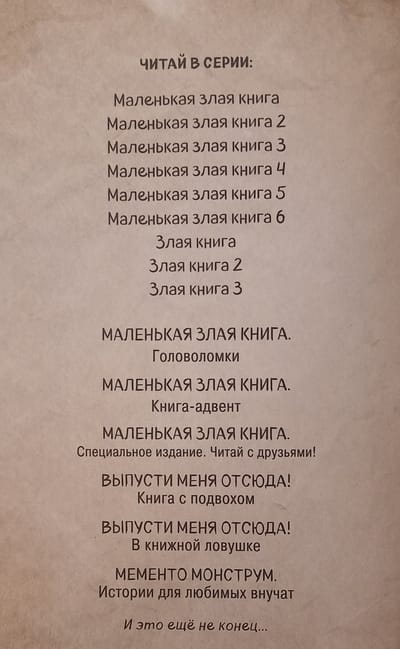 «Маленькая злая книга» снова удивляет! Фишка этого издания — запечатанные страницы, которые нужно открывать строго по 2 день (и так 24 раза!). Но что осталось неизменным — так это весёлые приключения, неожиданные повороты сюжета, разнообразные задания и встречи с удивительными героями.