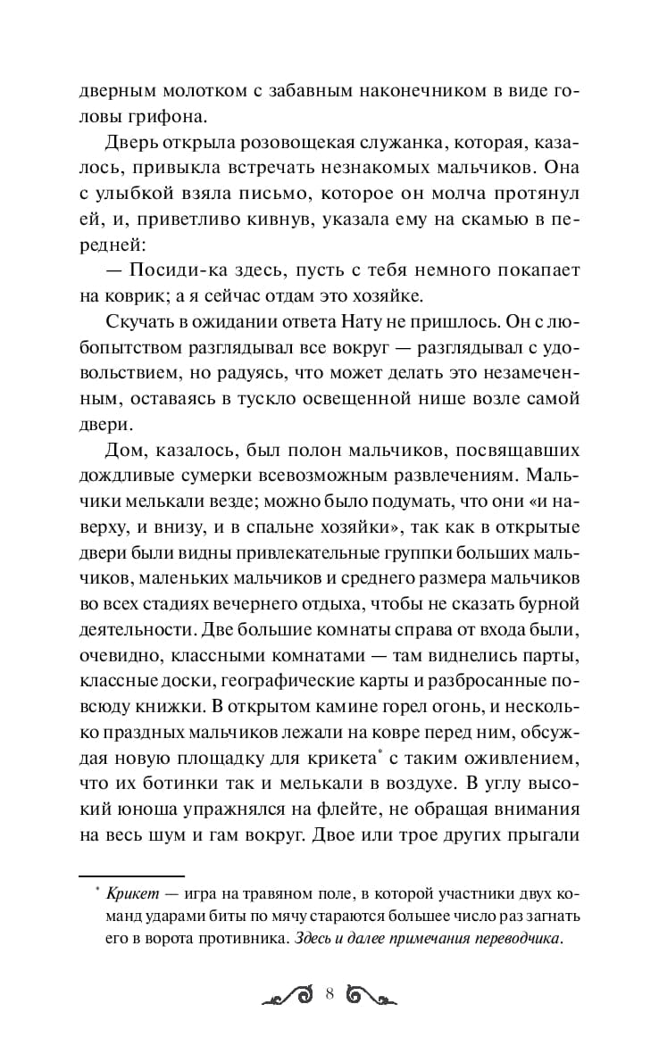 Третий роман американской писательницы Луизы Мэй Олкотт – о буднях и праздниках, маленьких победах и опасных приключениях воспитанников пансиона, который открыли Джо и Фриц Баэры. В пансионе ученики из разных социальных слоев учатся смелости, честности и доброте, а также занимаются самыми привычными для мальчишек вещами – веселятся, проказничают, находят друзей. Не так-то просто превратить непоседливых сорванцов в настоящих маленьких мужчин, однако нет на свете задачи, с которой Джо не смогла бы справиться.
