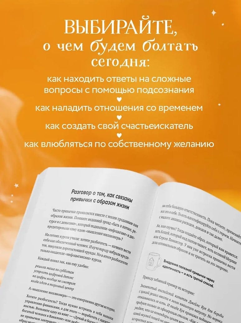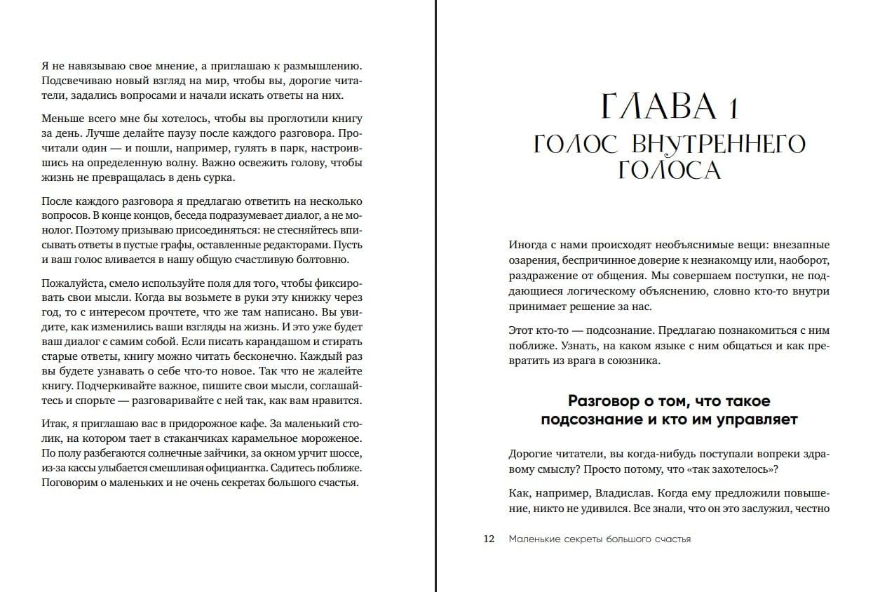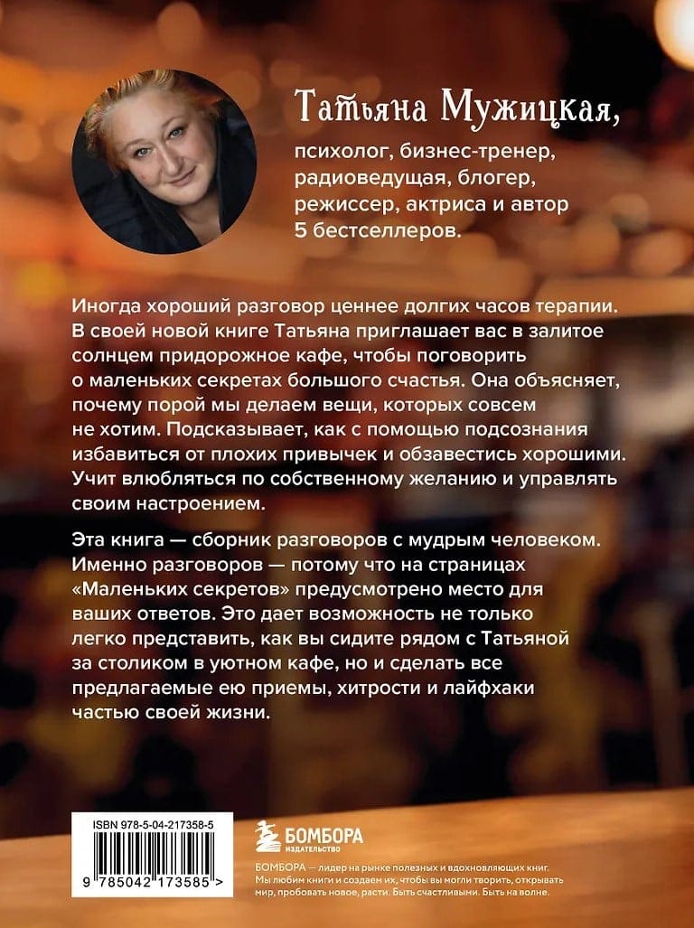 Иногда хороший разговор ценнее долгих часов терапии. В своей новой книге Татьяна приглашает вас в залитое солнцем придорожное кафе, чтобы поговорить о маленьких секретах большого счастья. Она объясняет, почему порой мы делаем вещи, которых совсем не хотим. Подсказывает, как с помощью подсознания избавиться от плохих привычек и обзавестись хорошими. Учит влюбляться по собственному желанию и управлять своим настроением. Эта книга — сборник разговоров с мудрым человеком. Именно разговоров — потому что на страницах «Маленьких секретов» предусмотрено место для ваших ответов. Это дает возможность не только легко представить, как вы сидите рядом с Татьяной за столиком в уютном кафе, но и сделать все предлагаемые ею приемы, хитрости и лайфхаки частью своей жизни.