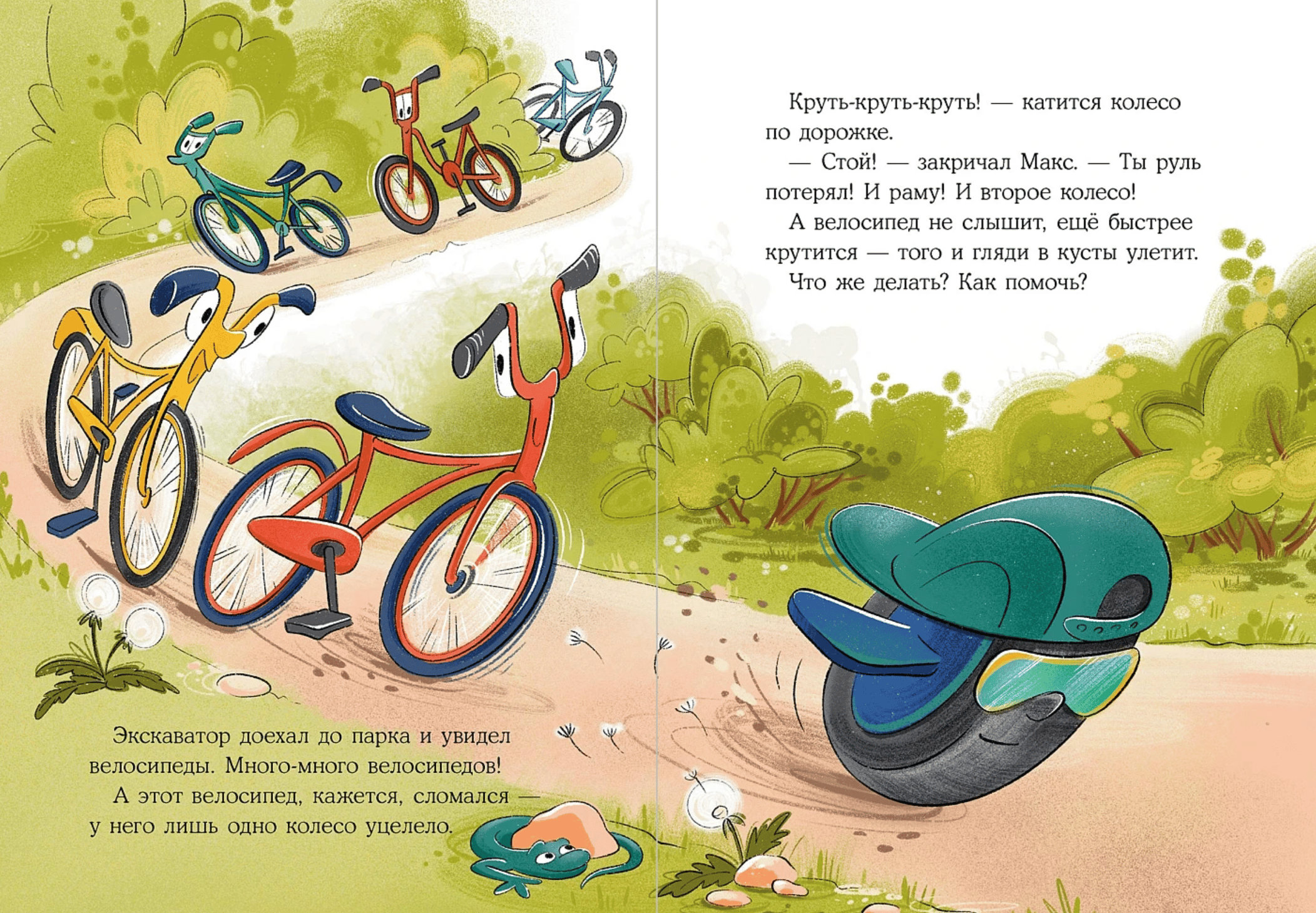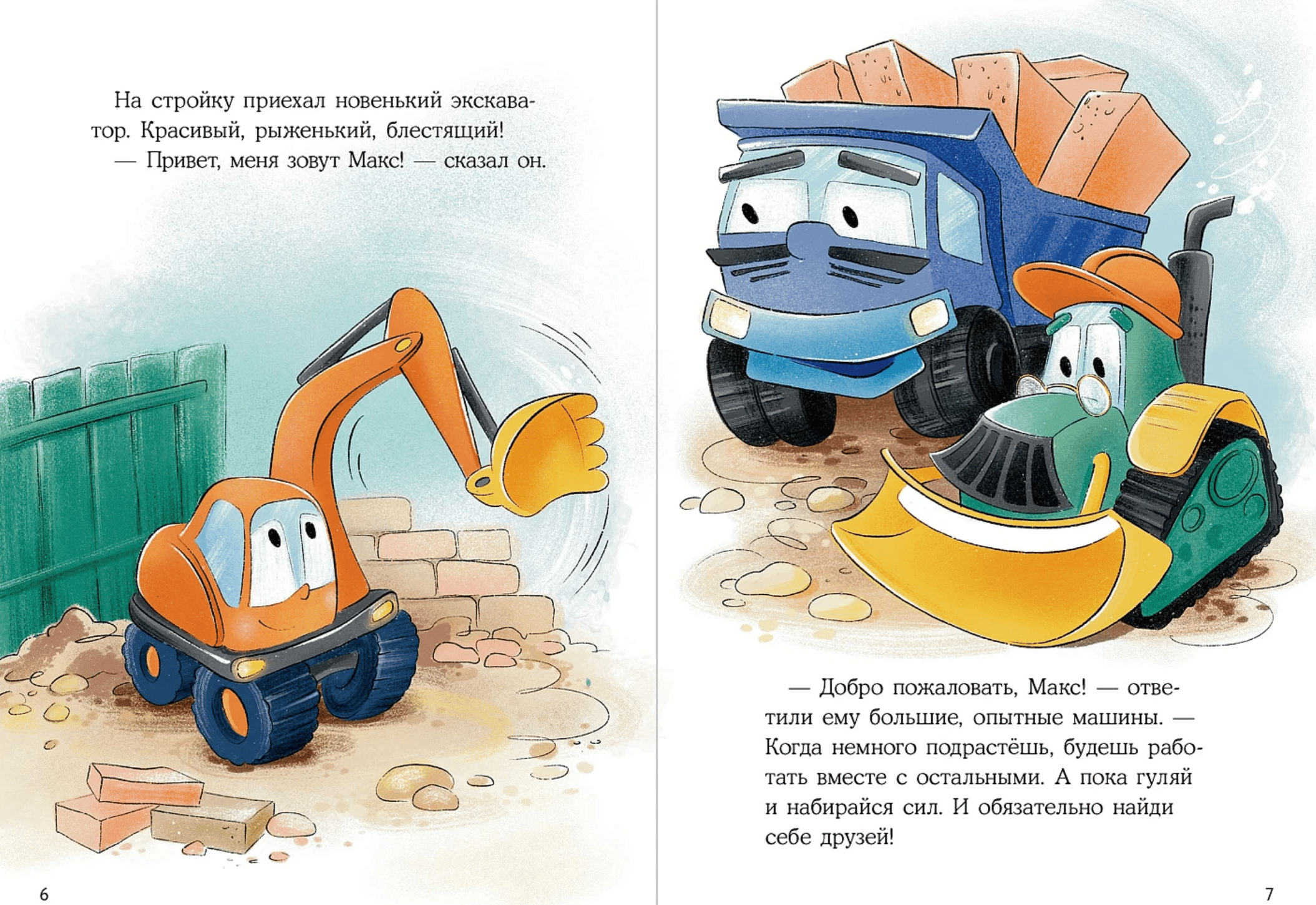 Однажды на стройке появился маленький экскаватор по имени Макс. Он ещё совсем новичок — рыжий, блестящий и очень любопытный. Макс отправляется в город, чтобы найти друзей, но оказывается, что это не так-то просто: велосипеды любят тишину, самокаты — трюки, а большие машины всё время спешат по своим делам.