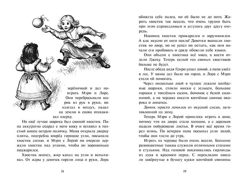 «Маленький домик в больших Лесах» – это первая книга знаменитой автобиографической эпопеи американской писательницы Лоры Инглз Уайлдер. Четырёхлетняя Лора живет на краю огромных лесов Висконсина вместе с сёстрами, верным псом Джеком и родителями – первыми переселенцами, осваивавшими свободные земли запада США. Жизнь семьи настолько сурова, что ребёнку двадцать первого века впору воскликнуть: как это всё возможно вытерпеть?! «Если пойдешь на север – иди хоть день, хоть неделю, хоть месяц, – нигде не увидишь ничего, кроме леса». Нужно тяжёлым трудом добывать пропитание, заранее готовиться к холодной зиме и остерегаться диких зверей, которые бродят вокруг дома. Но папа – единственный мужчина в семье – умеет всё: отливать пули, охотиться, пахать, сеять и собирать урожай, коптить мясо и замечательно играть на скрипке. И он нежно любит маму и своих дорогих дочек. Всю работу по дому выполняет терпеливая и заботливая мама: «Стирать — в понедельник, гладить — во вторник, штопать — в среду, сбивать масло — в четверг, убирать — в пятницу, печь хлеб — в субботу, отдыхать — в воскресенье. Дети воспитываются в религиозной строгости, в условиях ежедневного труда. А уж если Инглзам доводится принимать гостей или самим навещать соседей, действует строгий принцип: «Детей должно быть видно, но не слышно». Притом вся повесть от первой до последней страницы — это светлое, радостное воспоминание о счастливом детстве, просторном мире, любящих родственниках и добрых соседях, редких, но ярких и запомнившихся на всю жизнь праздниках. Благодаря поразительной художественной памяти писательницы, её вниманию к людям и вещам, книга читается легко, с живым интересом, а у юного читателя возникает естественное желание сравнить своё собственное детство с детством Лоры.