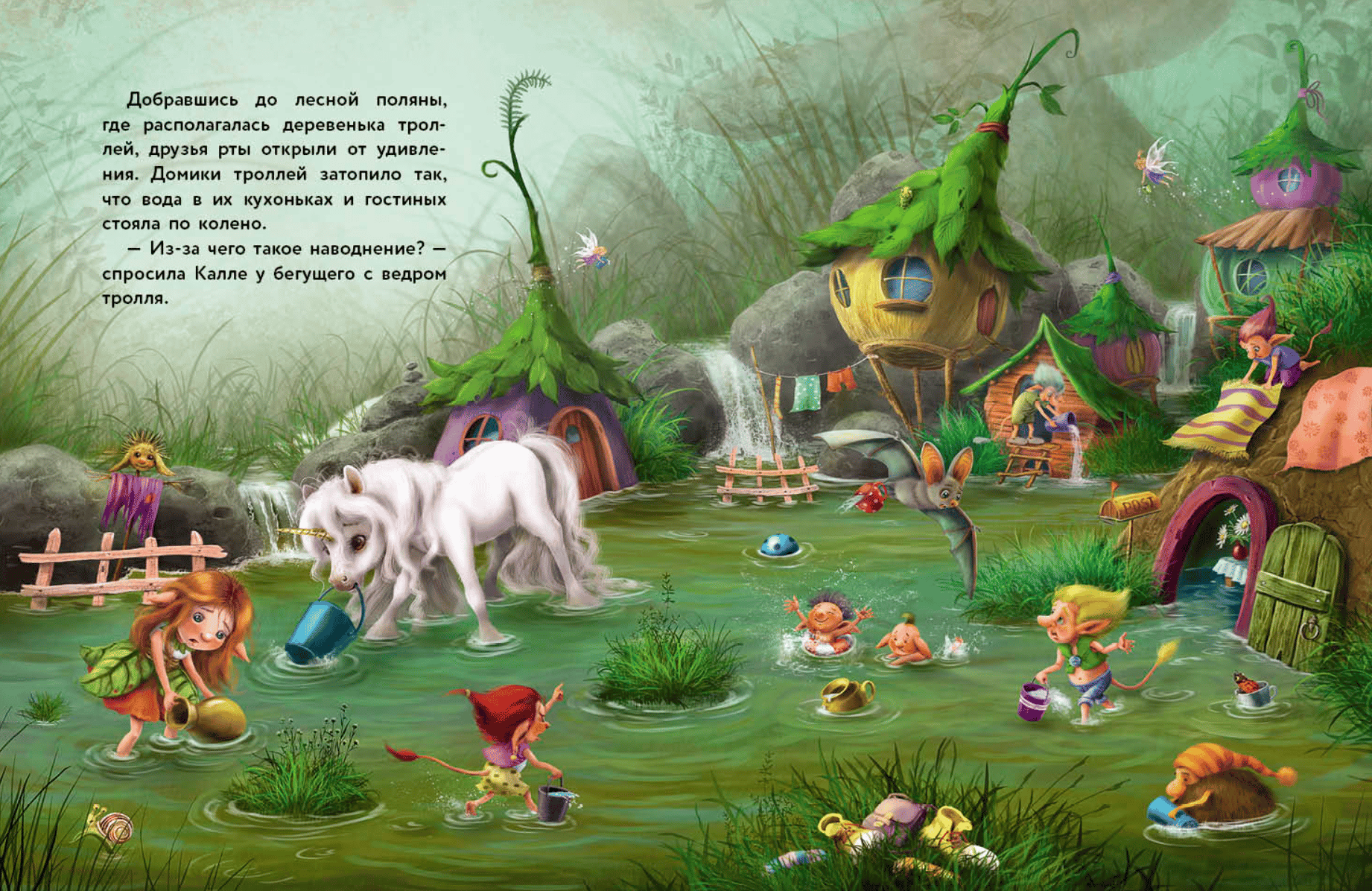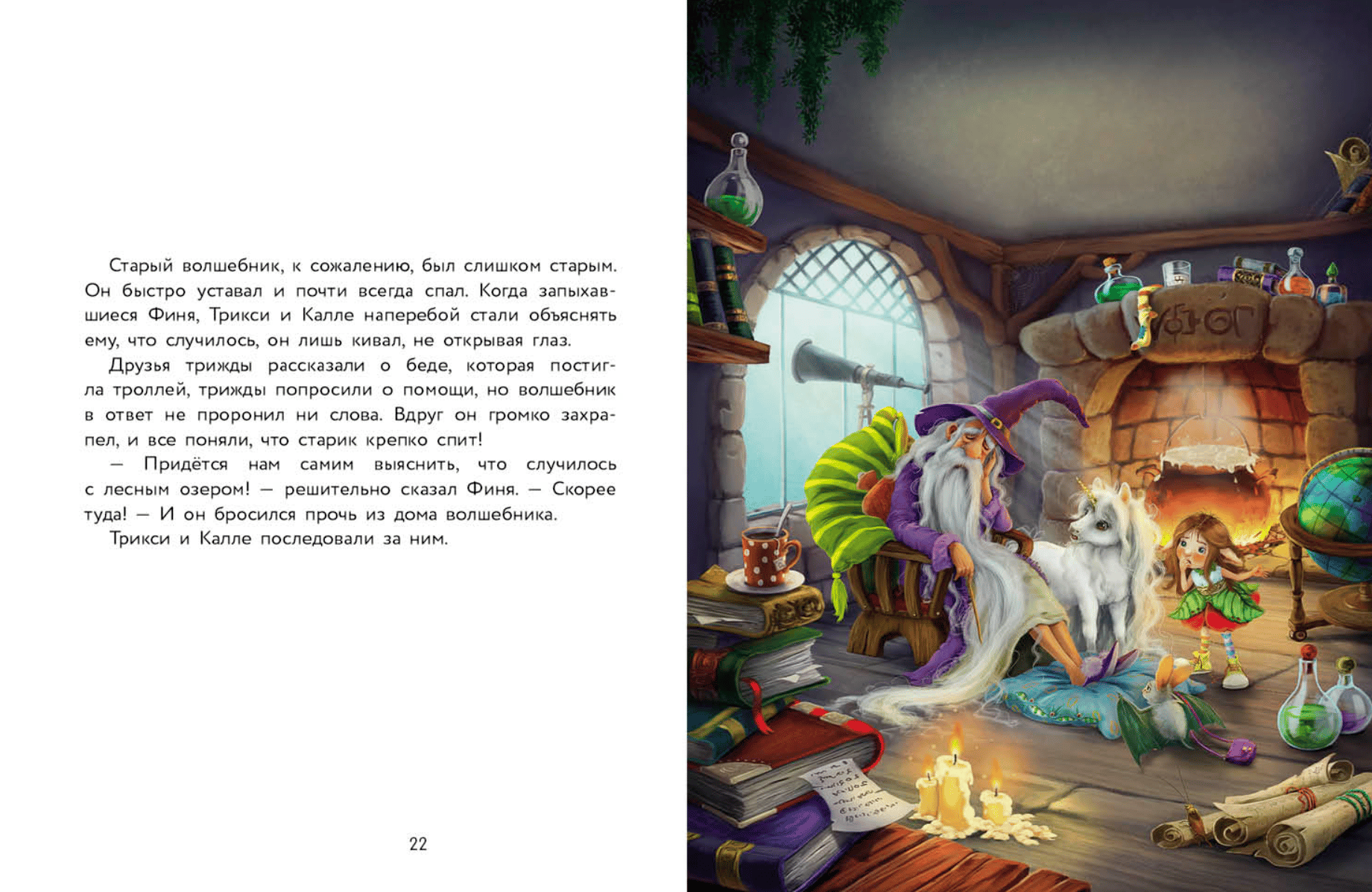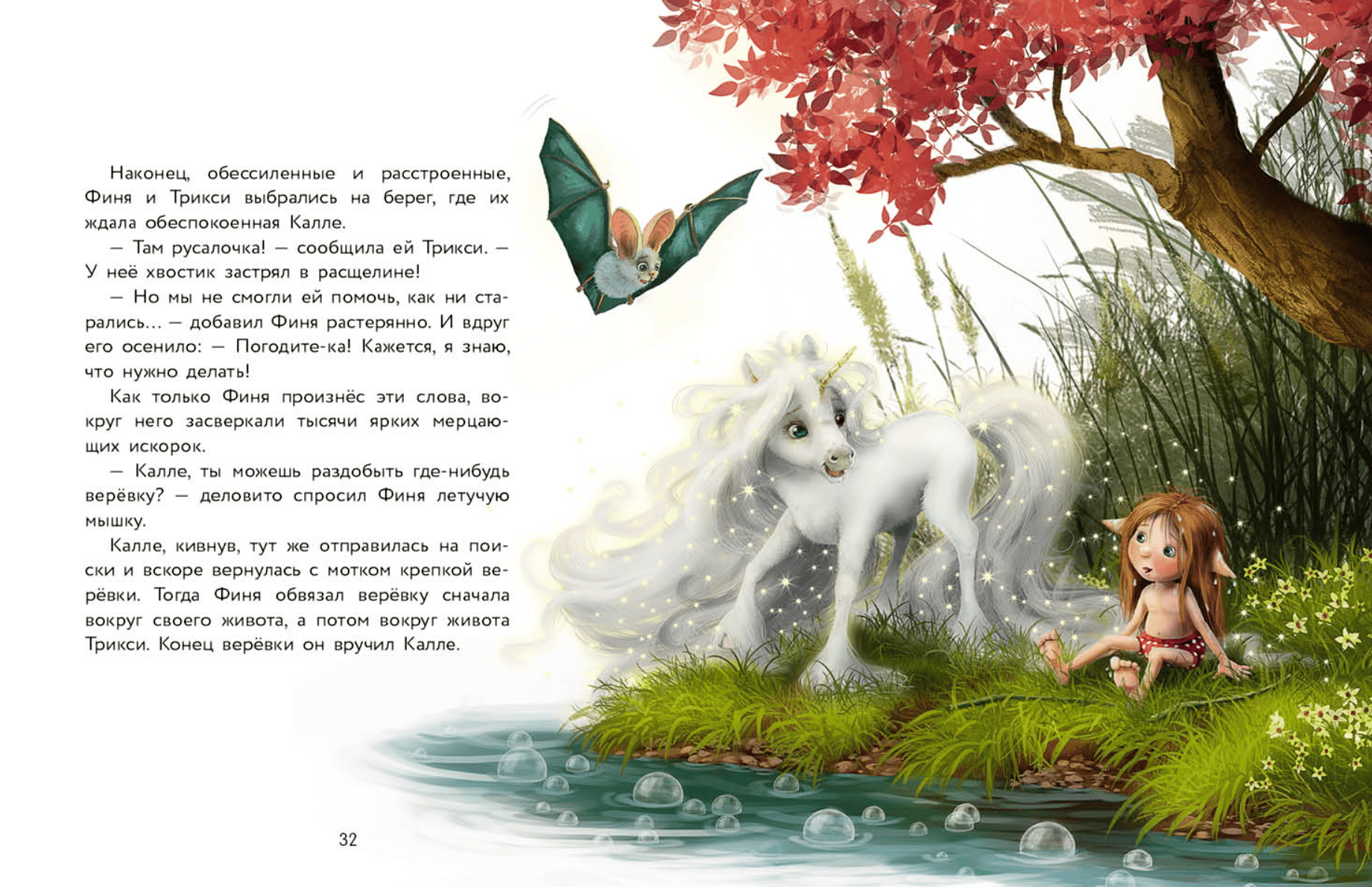 А вы знаете, что все единороги могут исполнять желания? Ну то есть почти все. Маленькому единорогу по имени Финя это пока не слишком хорошо удаётся. Зато у него есть верные друзья: летучая мышка Калле и девочка-эльф Трикси. Вместе им любое дело по плечу, и они всегда готовы прийти на помощь. В этот раз нужно срочно узнать, что случилось с лесным озером, воды которого затопили деревню троллей. Волшебство здесь бессильно. Значит, Финя, Трикси и Калле обойдутся без волшебства… Для младшего школьного возраста.