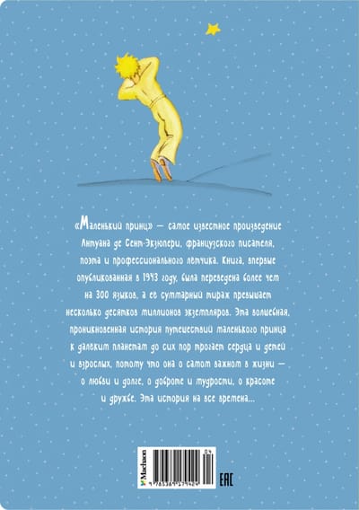 Антуан де Сент-Экзюпери (1900–1944) – французский писатель, поэт и профессиональный лётчик. Его самое известное произведение – повесть-сказка «Маленький принц». Книга впервые была опубликована в 1943 году, с тех пор переведена более чем на 300 языков, а её суммарный тираж превышает несколько десятков миллионов экземпляров. Волшебная история путешествий маленького мальчика по далёким планетам, история его удивительных знакомств с капризной, но очаровательной розой, мудрым лисом, величественным королём и многими другими и по сей день не оставляет равнодушными ни детей, ни взрослых.