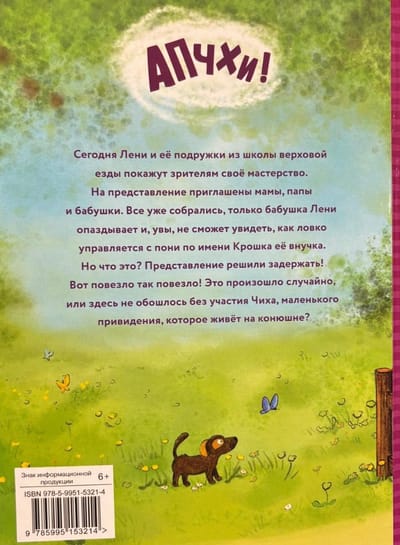 Сегодня Лени и её подружки из школы верховой езды покажут зрителям своё мастерство. На представление приглашены мамы, папы и бабушки. Все уже собрались, только бабушка Лени опаздывает и, увы, не сможет увидеть, как ловко управляется с пони по имени Крошка её внучка. Но что это? Представление решили задержать! Вот повезло так повезло! Это произошло случайно, или здесь не обошлось без участия Чиха, маленького привидения, которое живёт на конюшне?