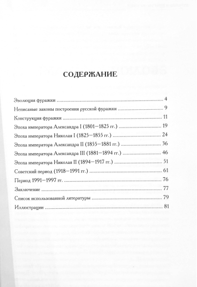 В издании рассматривается эволюция военной фуражки в армии России от ее возникновения до конца ХХ века. Публикуется текстовая хронология перемен и изображения внешнего вида и деталей этого головного убора. В работе приведены авторские рисунки особенностей конструкции фуражек различных родов войск и военных чинов.