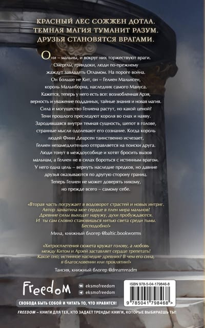 Теперь Кит — темный король Мальнборна, Гелиен Мальнсен, наследник древнего правителя Мануса. В его руках власть и могущество, мощная магическая сила, а рядом — возлюбленная невеста Арэя. Но тени прошлого преследуют короля во снах и наяву. Темная сущность, шепот в голове, странные мысли одолевают его сознание. Когда король людей, Финн Деарсен, таинственно исчезает, Гелиен незамедлительно отправляется на поиски друга. Междоусобица среди людского народа — настоящая угроза для Мальнборна, а Гелиен чувствует себя ослабленным, не способным противостоять истинному врагу. Он жаждет вернуть наследие предков, но боится доверять даже самому себе.