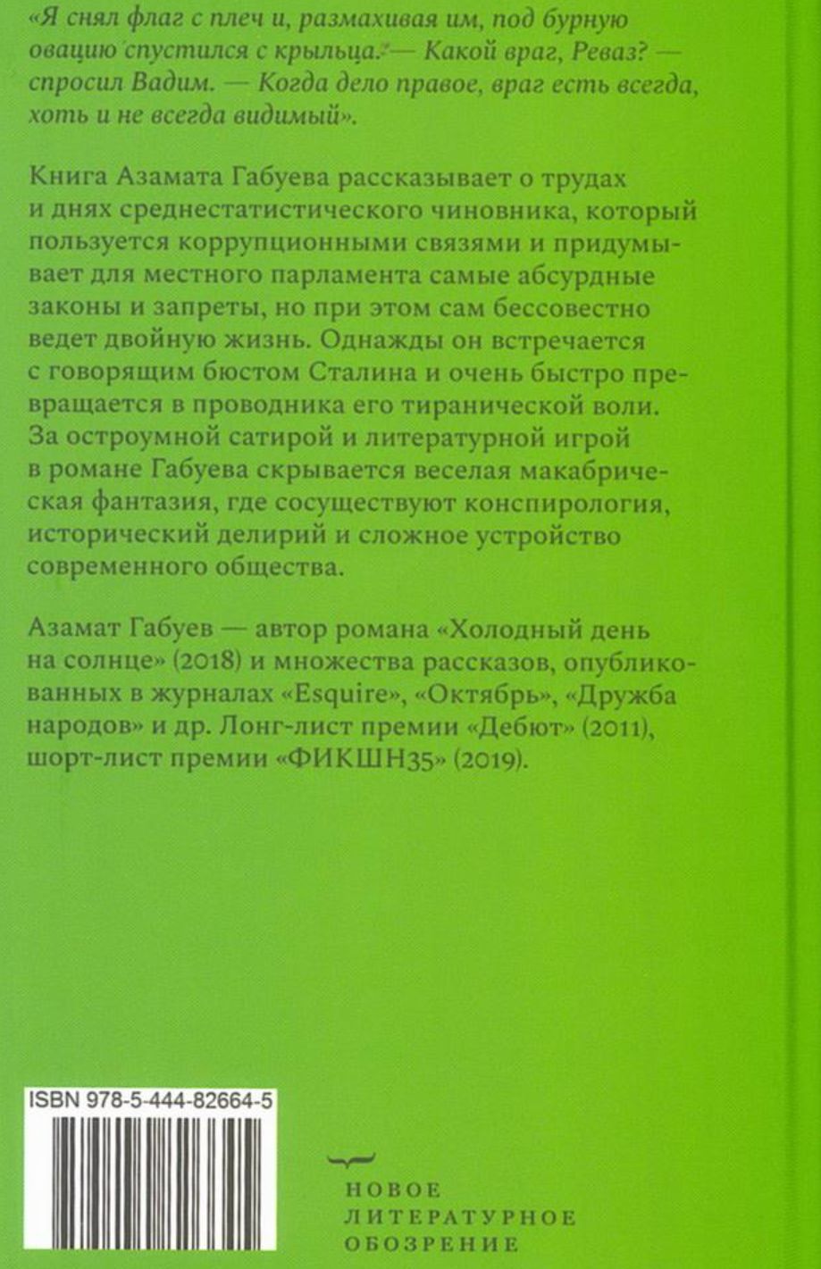 «Я снял флаг с плеч и, размахивая им, под бурную овацию спустился с крыльца. — Какой враг, Реваз? — спросил Вадим. — Когда дело правое, враг есть всегда, хоть и не всегда видимый». Книга Азамата Габуева рассказывает о трудах и днях среднестатистического чиновника, который пользуется коррупционными связями и придумывает для местного парламента самые абсурдные законы и запреты, но при этом сам бессовестно ведет двойную жизнь. Однажды он встречается с говорящим бюстом Сталина и очень быстро превращается в проводника его тиранической воли. За остроумной сатирой и литературной игрой в романе Габуева скрывается веселая макабрическая фантазия, где сосуществуют конспирология, исторический делирий и сложное устройство современного общества. Азамат Габуев — автор романа «Холодный день на солнце» (2018) и множества рассказов, опубликованных в журналах «Esquire», «Октябрь», «Дружба народов» и др. Лонг-лист премии «Дебют» (2011), шорт-лист премии «ФИКШН35» (2019).
