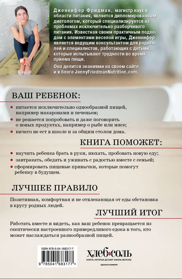 Эта книга для родителей, которые столкнулись с серьезной проблемой своих детей, а именно: отсутствием желания есть, непониманием, что без еды нельзя жить и расти. Автор книги Дженнифер Фридман ─ магистр наук в области питания, дипломированный диетолог, которая специализируется на проблемах исключительно разборчивого питания. Она рассказывает о нескольких семьях, с которыми работала и получила положительные результаты, и предлагает реальные практические пути изменения отношения детей и их родителей к еде, к процессу питания, к знакомству с продуктами, их выбору и приготовлению.