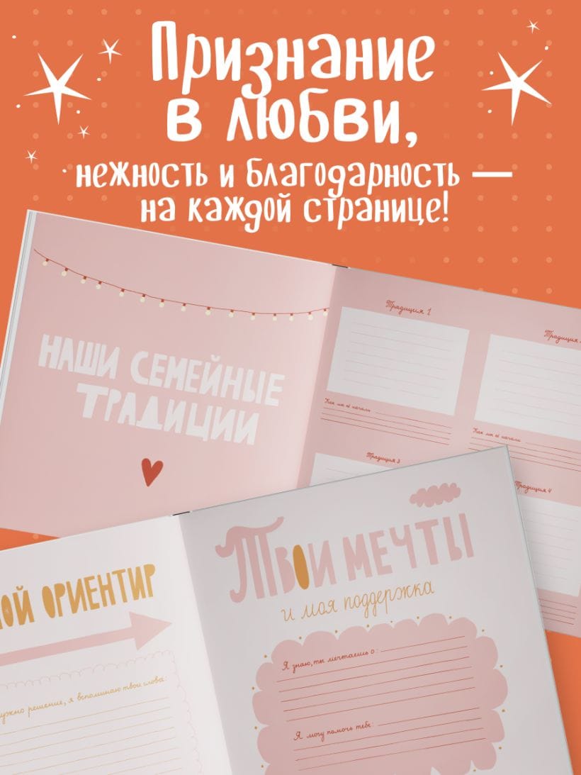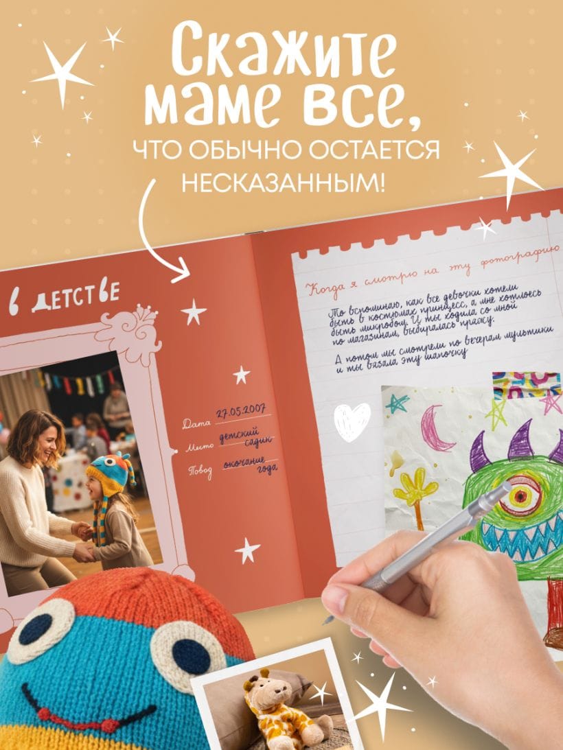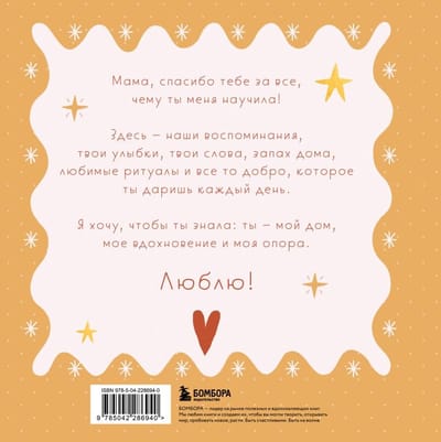 Это не просто книга — это место для вашей общей истории. Здесь нет готового текста, потому что главная героиня — ваша мама, а автор — вы. На 64 страницах — вопросы, творческие задания и уютные развороты, которые помогут рассказать ей все, что обычно остается несказанным. Вы расскажете маме, за что ее любите, какие у нее «суперсилы», какие воспоминания самые теплые. Вставите ваши любимые фотографии, вспомните смешные истории и шутки, опишете традиции, рецепты, песни и мечты. Письма, признания, фотографии «тогда и сейчас» — все это станет дорогим сердцу напоминанием о близости и поддержке. Книга будет жить и меняться, потому что ее можно дополнять и после вручения.