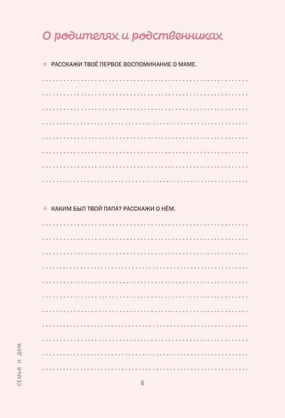Эта книга — не просто семейный альбом или сборник вопросов. Эта книга — ваше признание в любви своей маме. Заполните ее вместе с ней или запишите ответы самостоятельно с ее слов и создайте семейное древо. Если хотите, можете задавать вопросы последовательно, ведь все они расположены хронологически — от детства к нынешнему возрасту. Но на самом деле никаких правил нет! Можете начать диалог с любого места и дальше ориентироваться на ход беседы, переходя от раздела к разделу в зависимости от приходящих воспоминаний. Пусть эта новая традиция станет шагом к узнаванию уникальной истории вашей семьи.
