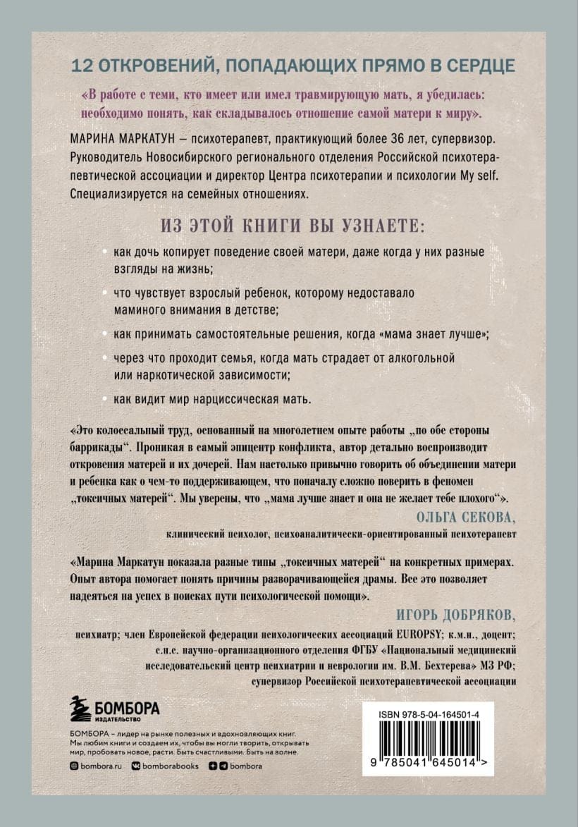 Елена гордится, что стала матерью и посвятила всю свою жизнь дочери. Ее советы всегда важны для подруг, но вот только дочь почему-то не совсем согласна. Это у нее такой характер — вся в отца. А ведь в детстве была совсем другим ребенком. Лида очень чувствительный и болезненный человек. Но ей повезло — ее дочь всегда рядом. Даже живет теперь на одной лестничной площадке. Лиде нельзя нервничать: как только стресс, так сразу «Скорая». Дочь всегда волнуется за нее и все бросает, когда матери это нужно. Все в семье Зои держится на ней. Дочь вышла замуж и сама уже мать, но как ее можно оставить без контроля? Обязательно что-нибудь происходит не так. И что вообще значит «оставить дочь в покое»? Зоя же мать! Люди приходят и уходят, а дочь навсегда. Психотерапевт Марина Маркатун более 36 лет наблюдает в своем кабинете за сложными отношениями между матерью и дочерью. Она убедилась, что недостаточно описать личность и определить тип отношений. Нужно понять, как видит мир мать, а как на те же самые события смотрит дочь.12 матерей и их взрослые дочери рассказывают историю своей жизни. Каждую сопровождает комментарий специалиста, в котором автор объясняет поведение матерей и дает свои рекомендации для выхода из конфликта. Все истории основаны на реальных случаях из практики.
