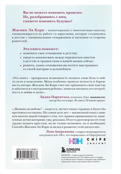 В жизни не так много переживаний, настолько же глубоких, как чувства, которые мы испытываем к нашим матерям. Корни некоторых этих чувств теряются в темных тайниках доречевого опыта. Ветви расходятся во все стороны, одни несут дивные, пропитанные солнцем моменты, а другие обломаны, с острыми и занозистыми краями, за которые мы постоянно цепляемся. Мать — не простая тема. Мы защищаем образ матери внутри себя, защищаем наши хрупкие с ней отношения путем отрицания всего, что могло бы его расшатать, и защищаем себя от разочарования, злости и боли, которые вытесняем из сознания. В своей книге психотерапевт Жасмин Ли Кори рассказывает, как исцелиться от детских психологических травм и стать уверенным в своих силах любящим взрослым.