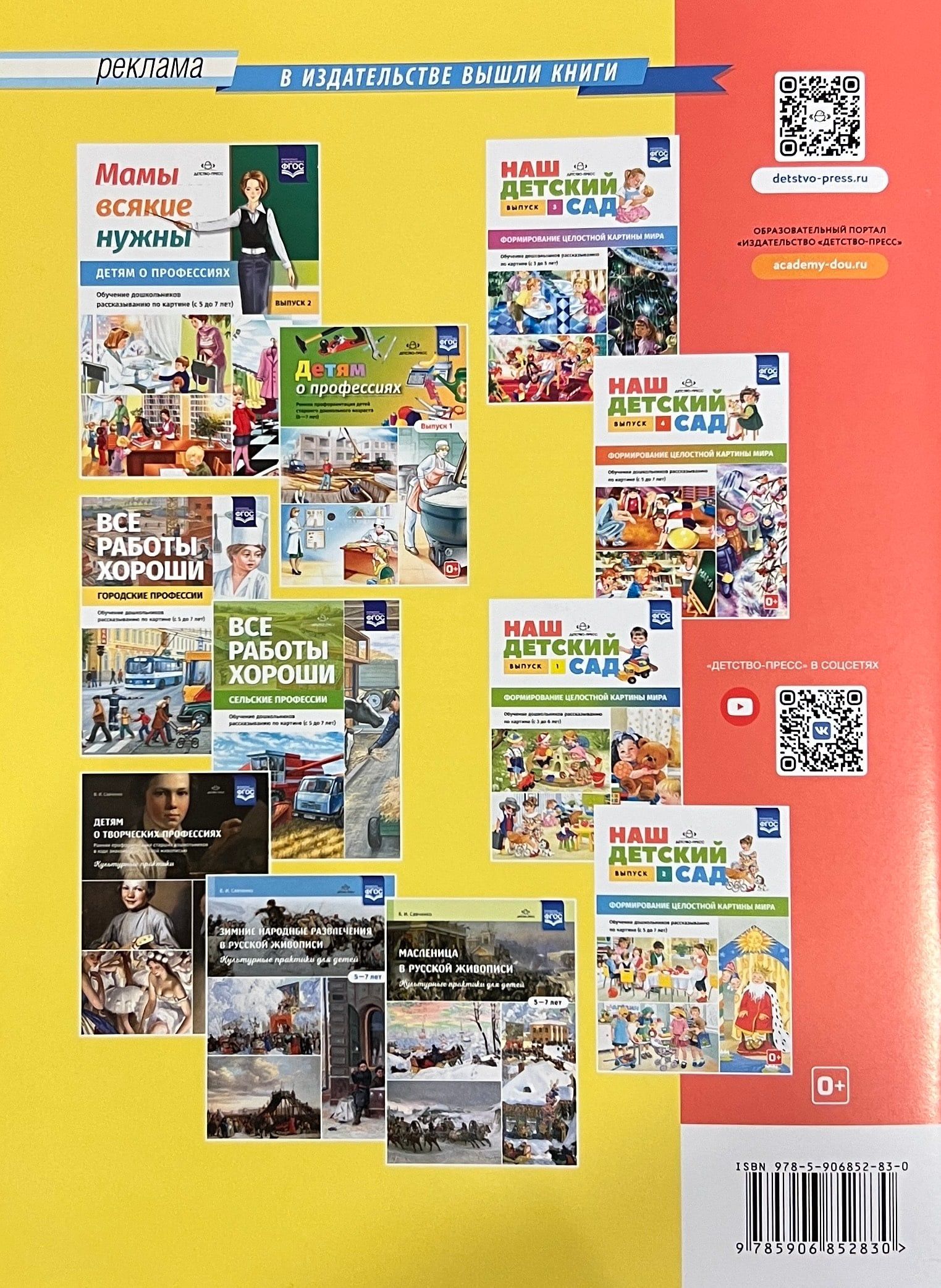 Серия демонстрационных картин с методическими рекомендациями по обучению дошкольников рассказыванию. В комплект входят 4 демонстрационных картины, изображающих представительниц типично женских профессий («профессий мам»), методические рекомендации по обучению дошкольников старших возрастных групп рассказыванию по картине, тексты бесед по картинам. Приведены примерные конспекты интегрированных занятий и описание дидактических игр. Для педагогов дошкольных образовательных учреждений общего и коррекционного вида.