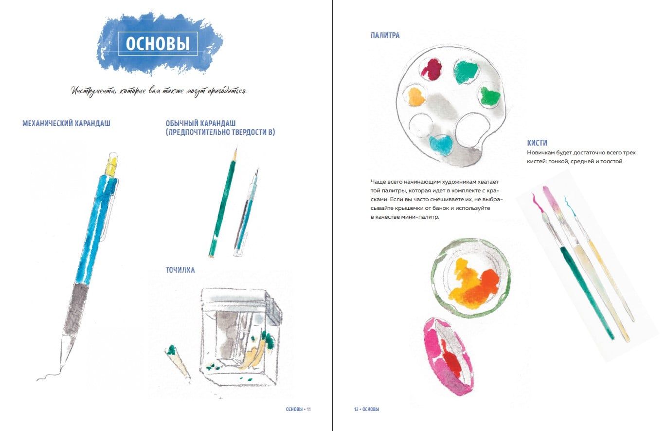 - все о работе с простейшими материалами — карандашами и акварелью;