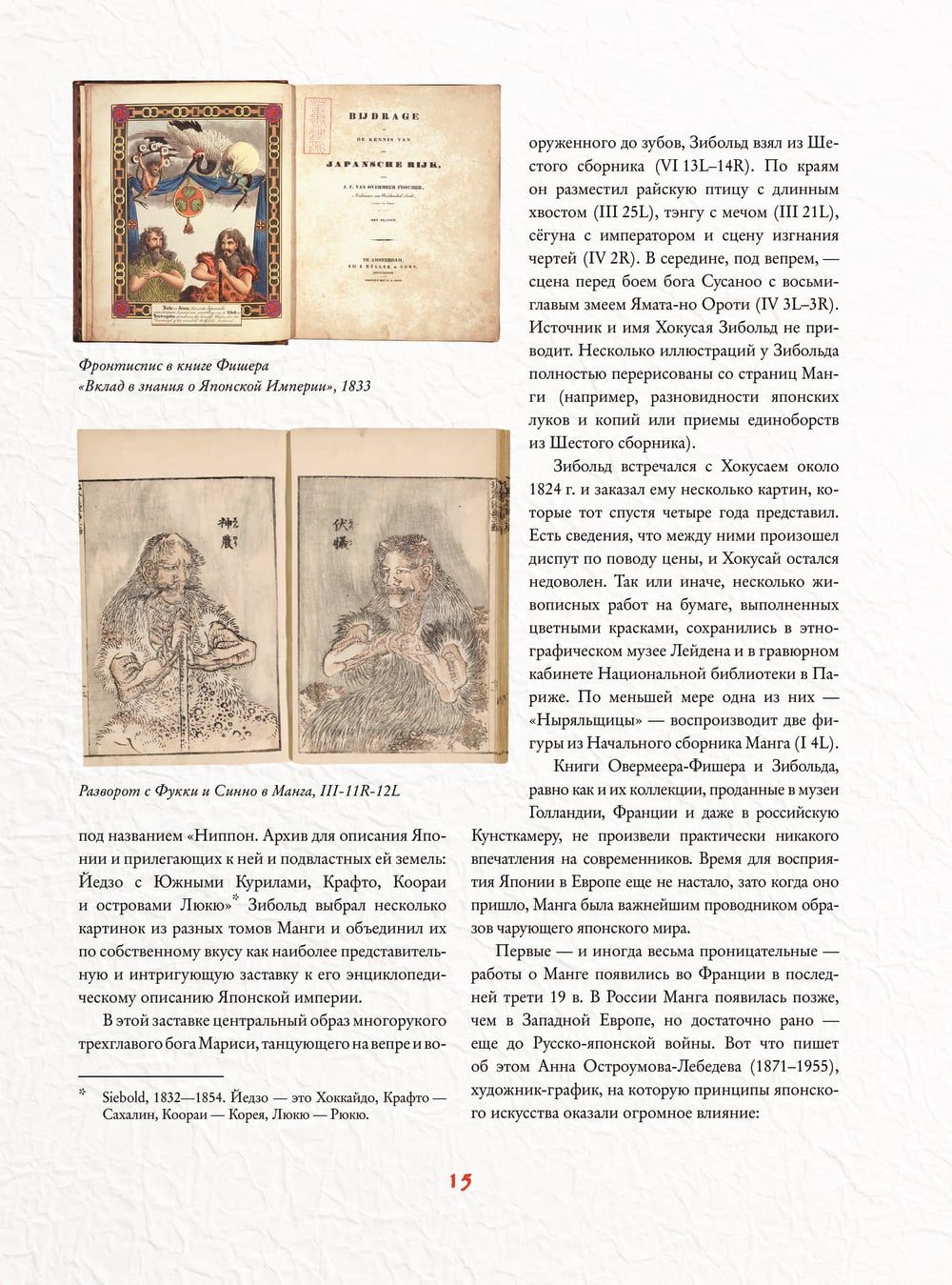 Кацусика Хокусай (1760–1849) – один из самых известных японских художников периода Эдо. На протяжении всей своей жизни он выпускал в свет альбомы гравированных рисунков под названием «Манга». В пятнадцати выпусках с четырьмя тысячами фигур и мотивов Хокусай представил энциклопедию старой Японии в картинках – начиная от богов и героев древности и заканчивая современными ему амурными делами, домашней утварью и разнообразными природными видами.