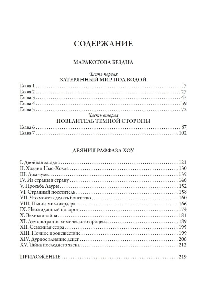 Книга включает научно-фантастический роман «Маракотова бездна» знаменитого английского писателя Артура Конан Дойла (1859–1930), а также его повесть «Деяние Раффлза Хоу». В обоих этих произведениях Дойл проявляет свое незаурядное писательское мастерство, невероятно закручивая интригующий сюжет. Все тексты даны в переводе Дмитрия Мочнева. Книгу украшают иллюстрации, которые появлялись на страницах различных зарубежных периодических изданий, впервые печатавших произведения Дойла. В конце издания также приведены иллюстрации к «Маракотовой бездне», выполненные французским художником Рене Гиффи (1884–1965) для журналов «Le Pele-Mele» и «Sciences et Voyages».