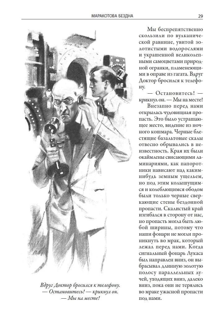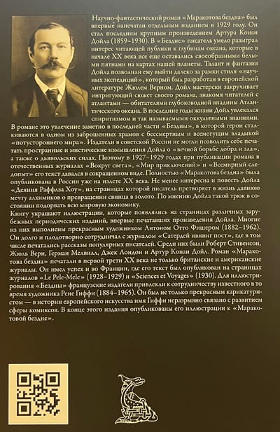 Научно-фантастический роман «Маракотова бездна» был впервые напечатан отдельным изданием в 1929 году. Он стал последним крупным произведением Артура Конан Дойла (1859-1930). В «Бездне» писатель умело разыграл интерес читающей публики к глубинам океана, которые в начале ХХ века все еще оставались своеобразными белыми пятнами на картах нашей планеты. Талант и фантазия Дойла позволили ему выйти далеко за рамки стиля «научных экспедиций», который был разработан в европейской литературе Жюлем Верном. Дойл мастерски закручивает интригующий сюжет своею романа, знакомя читателей с атлантами -обитателями глубоководной впадины Атлантического океана. В последние годы жизни Дойл увлекался спиритизмом и так называемыми оккультными знаниями. В романе это увлечение заметно в последней части «Бездны», в которой герои сталкиваются в одном из заброшенных храмов с бессмертными всемогущим владыкой «потустороннего мира». Издатели в советской России не могли позволить себе печатать пространные и мистические измышления Дойла о «вечной борьбе добра и зла», а также о дьявольских силах. Поэтому в 1927-1929 годах при публикации романа в отечественных журналах «Вокруг света», «Мир приключений» и «Всемирный следопыт» его текст давался в сокращенном виде. Полностью «Маракотова бездна» была опубликована в России уже на излете ХХ века. Не менее интересна и повесть Дойла «Деяния Раффлза Хоу», на страницах которой писатель претворяет в жизнь давнюю мечту алхимиков о превращении свинца в золото. По мнению Дойла такой трюк в состоянии подорвать всю мировую экономику. Книгу украшают иллюстрации, которые появлялись на Страницах различных зарубежных периодических изданий, впервые печатавших произведения Дойла. Многие из них выполнены прекрасным художником Антоном Отто Фишером (1882-1962). Он долго и плодотворно сотрудничал с журналом «Сатердей ивнинг пост», где в том числе печатались рассказы популярных писателей. Среди них были Роберт Стивенсон, Жюль Верн, Герман Мелвилл, Джек Лондон и Артур Конан Дойл. Роман «Маракотова бездна» печатали в первой трети ХХ века не только британские и американские журналы. Он имел успех и во Франции, где его текст был опубликован на страницах журналов «Le Pele-Mele» (1928-1929) и «Sciences et Vоyages» (1930). Для иллюстрирования «Бездны» французские издатели привлекли к сотрудничеству известного в то время художника Рене Гиффи (1884-1965). Он был не только прекрасным карикатуристом — в истории европейского искусства имя Гиффи неразрывно связано с развитием сферы комиксов. В конце этого издания опубликованы его иллюстрации к «Маракотовой бездне».