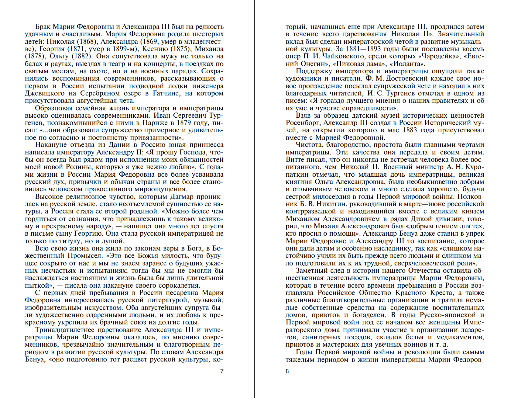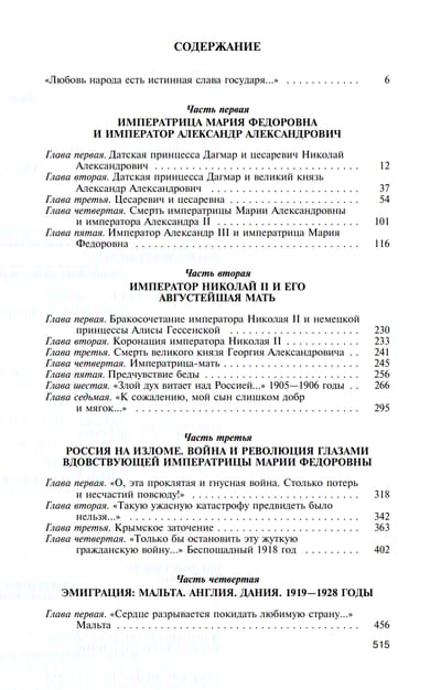 Книга посвящена жизни и деятельности императрицы Марии Федоровны Романовой, урожденной датской принцессы Дагмар (1847—1928), — супруги императора Александра III, матери последнего русского императора Николая II, имя которой на протяжении более 80 лет в нашей стране было предано забвению. Между тем она была человеком незаурядным. Современники отмечали ее ум и решительность, дипломатические способности и политическую интуицию, и все эти качества сильной личности гармонично сочетались с прелестными манерами, хрупкостью и обаянием очаровательной женщины. Она была безупречной женой и матерью, верным другом и советником как своему мужу, так и сыну, много сделала для совершенствования образования и развития культуры в России. Ее огромная общественная и благотворительная деятельность вызывала уважение и в светских кругах, и среди творческой интеллигенции, и среди простого народа. Отличительной чертой ее личности было страстное желание послужить благу России, которую она полюбила всей душой сразу и навсегда.