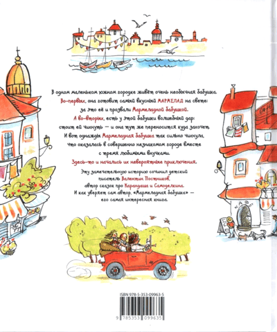 В одном маленьком южном городке живет очень необычная бабушка. Во-первых, она готовит самый вкусный мармелад на свете: за это ее и прозвали Мармеладной бабушкой. А во-вторых, есть у этой бабушки волшебный дар: стоит ей чихнуть — и она тут же переносится куда захочет. И вот однажды Мармеладная бабушка так сильно чихнула, что оказалась в совершенно незнакомом городе вместе с тремя любимыми внучками. Здесь-то и начались их невероятные приключения.