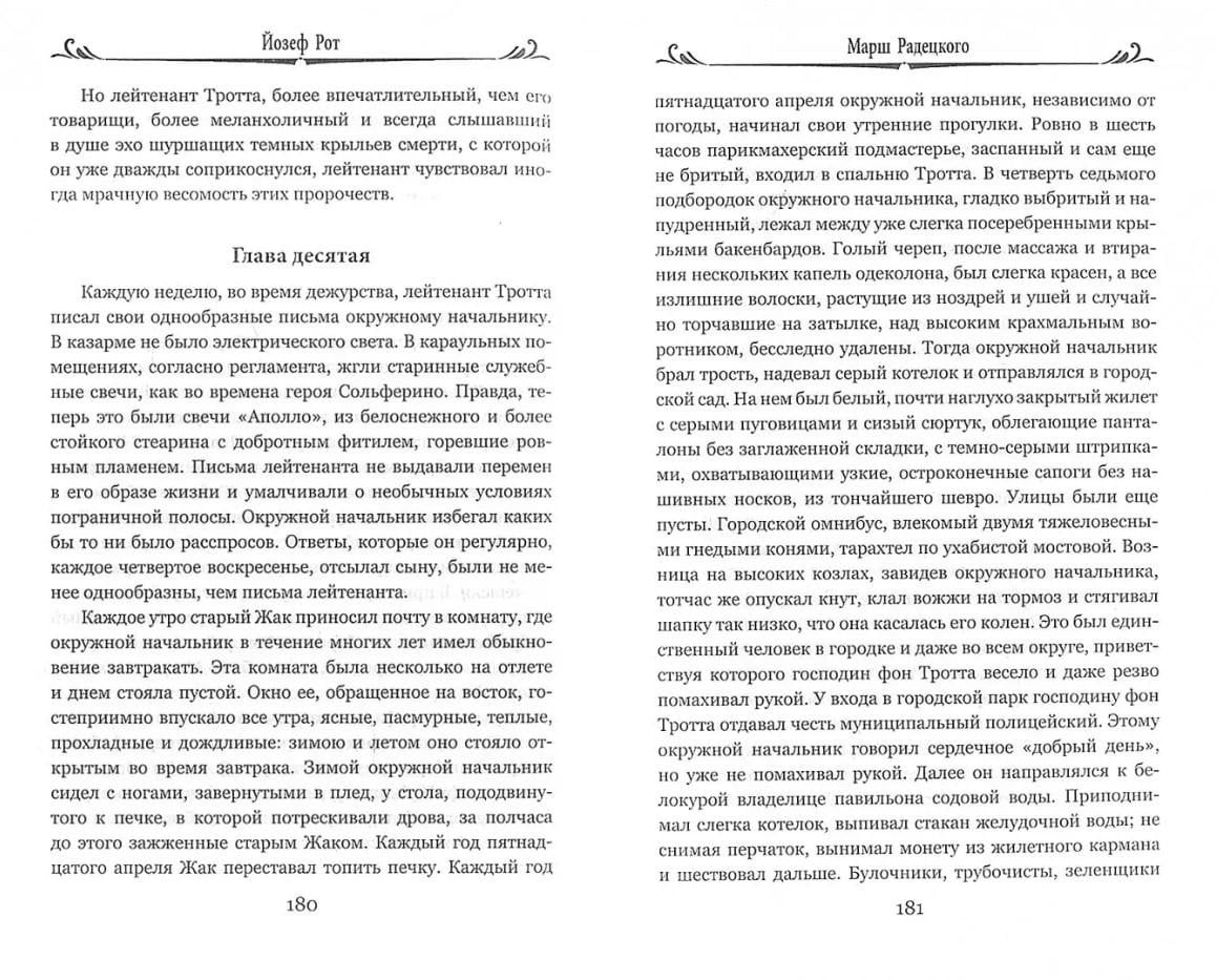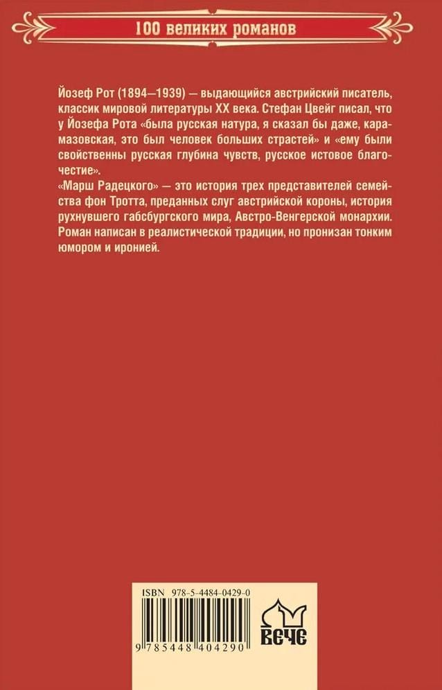Йозеф Рот (1894—1939) — выдающийся австрийский писатель, классик мировой литературы ХХ века. Стефан Цвейг писал, что у Йозефа Рота «была русская натура, я сказал бы даже, карамазовская, это был человек больших страстей» и «ему были свойственны русская глубина чувств, русское истовое благочестие». «Марш Радецкого» — это история трех представителей семейства фон Тротта, преданных слуг австрийской короны, история рухнувшего габсбургского мира, Австро-Венгерской монархии. Роман написан в реалистической традиции, но пронизан тонким юмором и иронией.