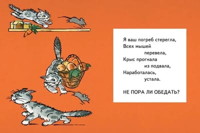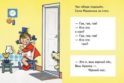 Села Машенька обедать, а тут и гости пожаловали: верный пёс Арапка, кошка Мурка и курочка-ряба. Каждый из них славно потрудился — не забыла ли Маша, что пора и помощников накормить?