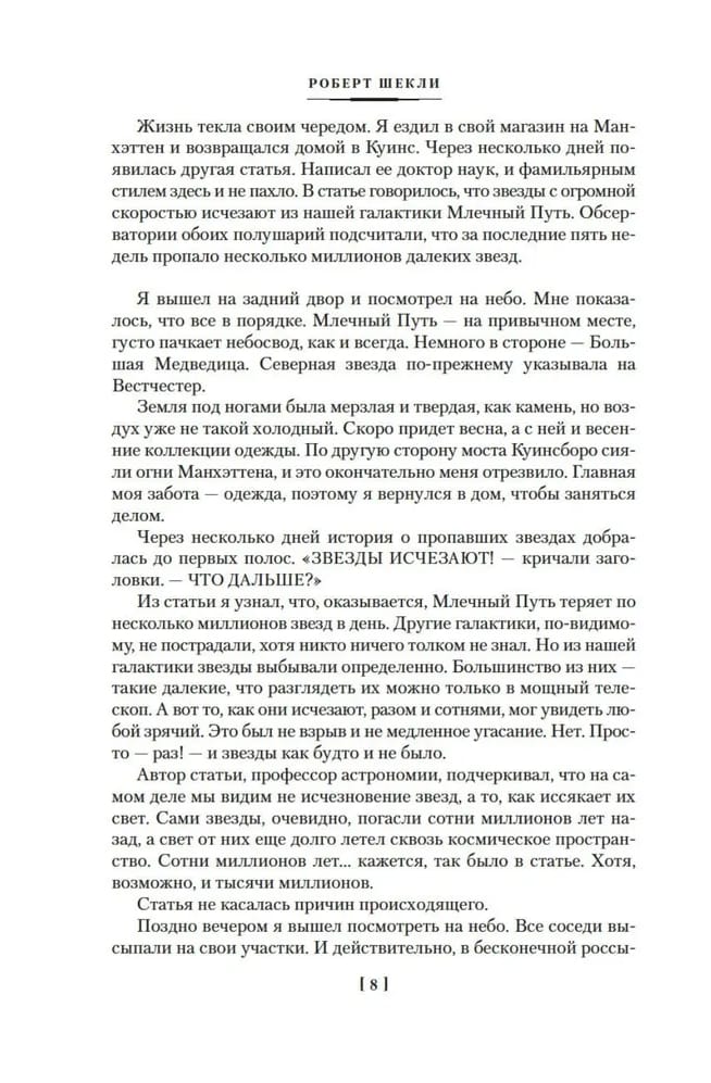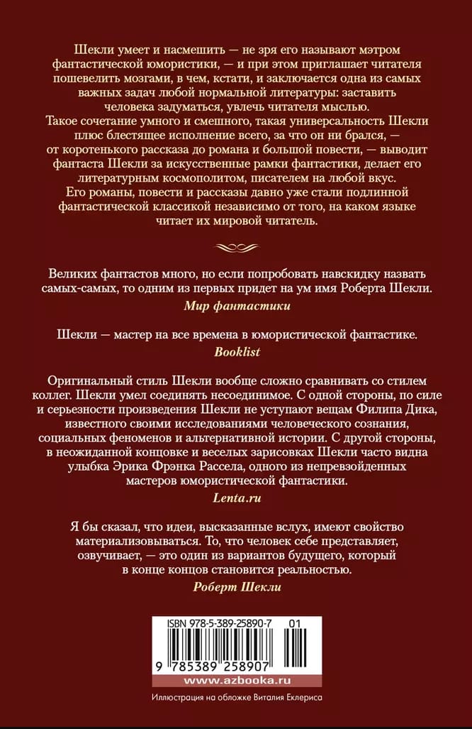 Шекли умеет и насмешить — не зря его называют мэтром фантастической юмористики, — и при этом приглашает читателя пошевелить мозгами, в чем, кстати, и заключается одна из самых важных задач любой нормальной литературы: заставить человека задуматься, увлечь читателя мыслью. Такое сочетание умного и смешного, такая универсальность Шекли плюс блестящее исполнение всего, за что он ни брался, — от коротенького рассказа до романа и большой повести, — выводит фантаста Шекли за искусственные рамки фантастики, делает его литературным космополитом, писателем на любой вкус. Его романы, повести и рассказы давно уже стали подлинной фантастической классикой независимо от того, на каком языке читает их мировой читатель.