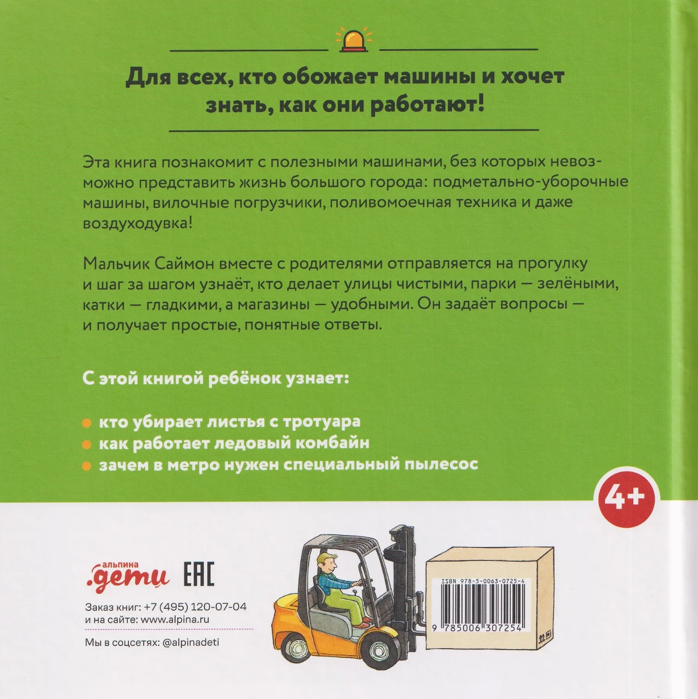 Вместе с Саймоном читатель отправится в путешествие по городу, чтобы узнать, какие машины и люди стоят за его безупречной работой. Мы увидим, как подметально-уборочные машины очищают дороги, как мощные каналопромывочные грузовики справляются с засорами, как вилочные погрузчики перемещают тяжести, а специальные снегоуборочные комбайны делают катки идеальными. Эта история поможет увидеть в обычных городских службах настоящих супергероев, которые ежедневно трудятся, чтобы город был чистым и комфортным..