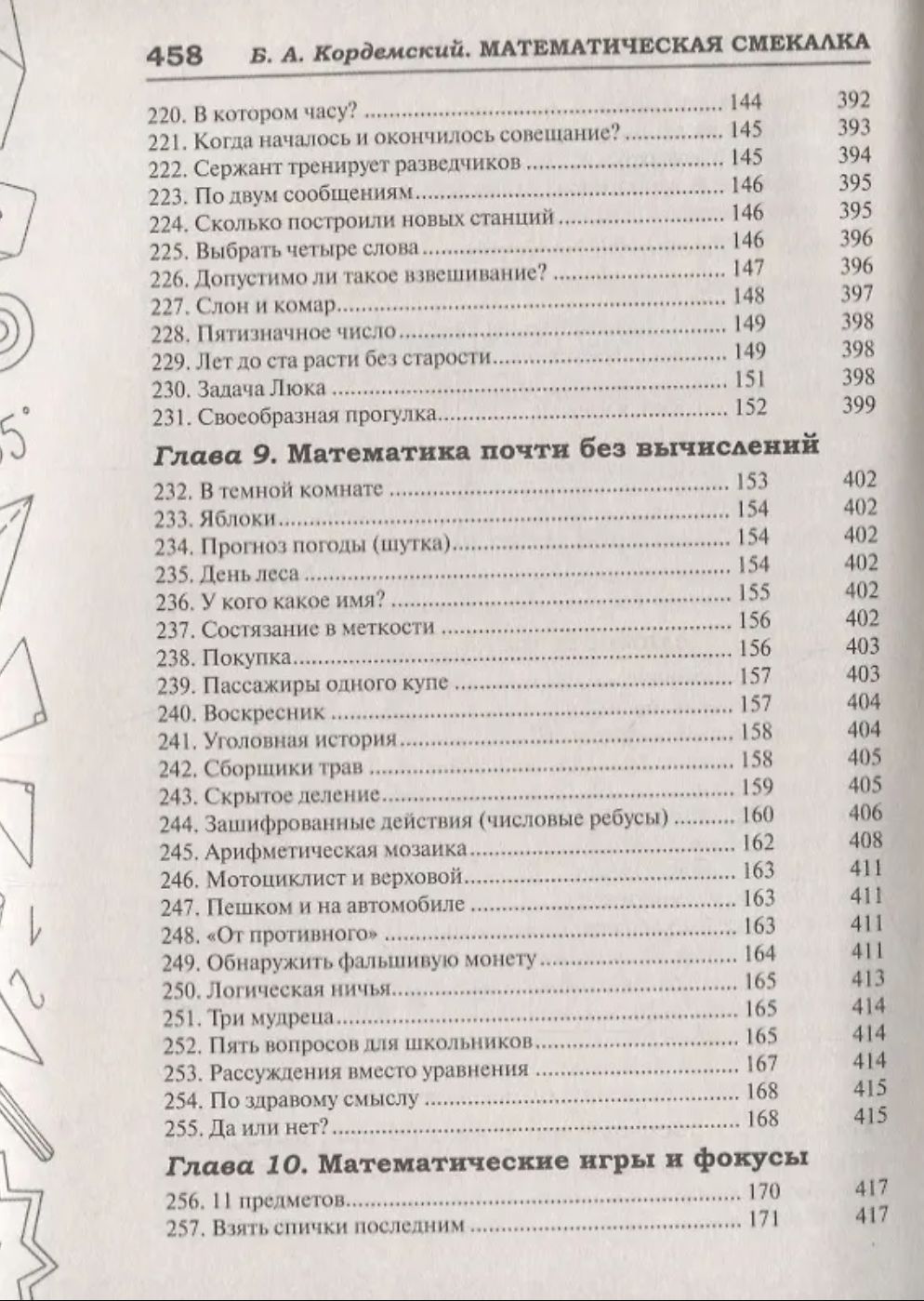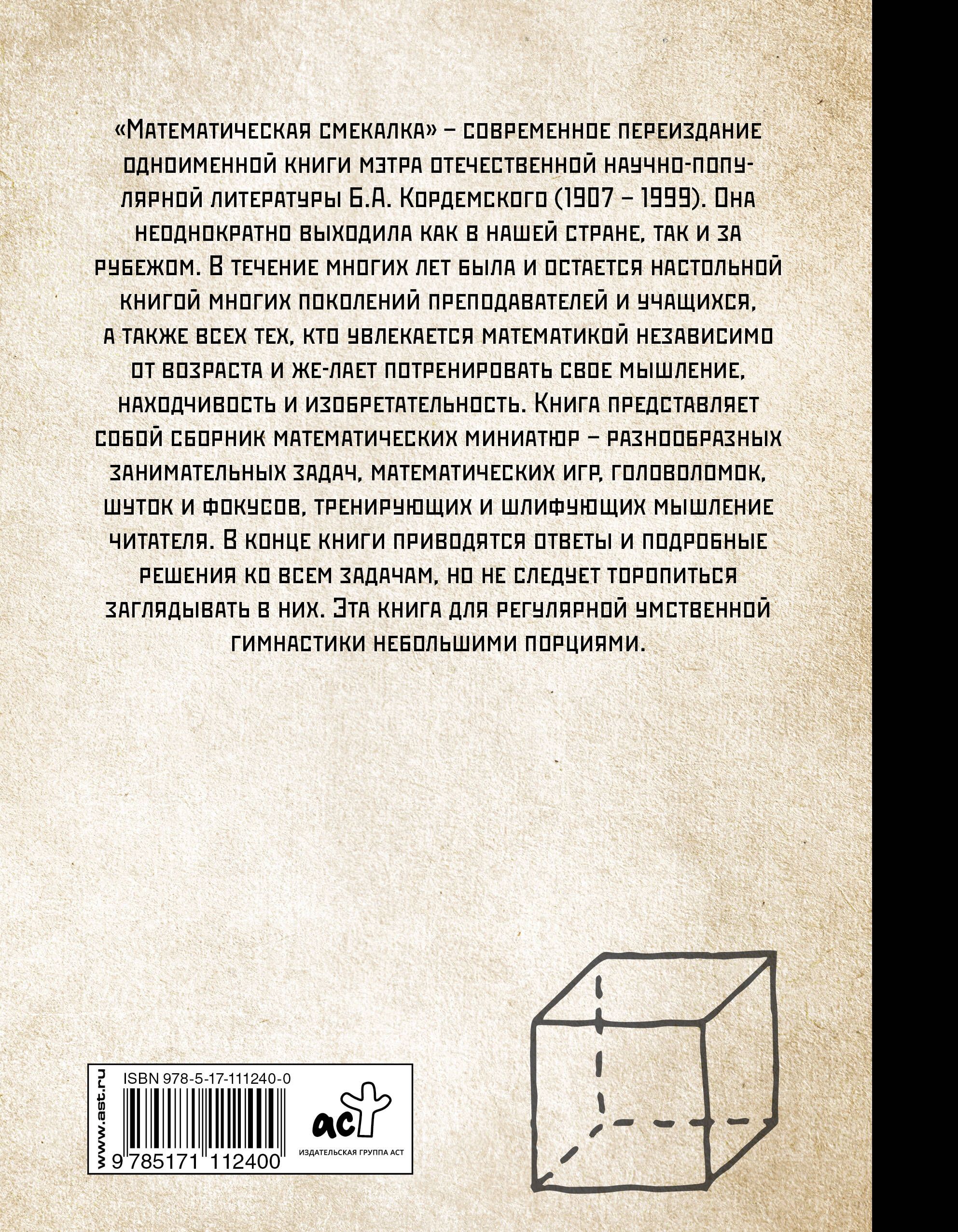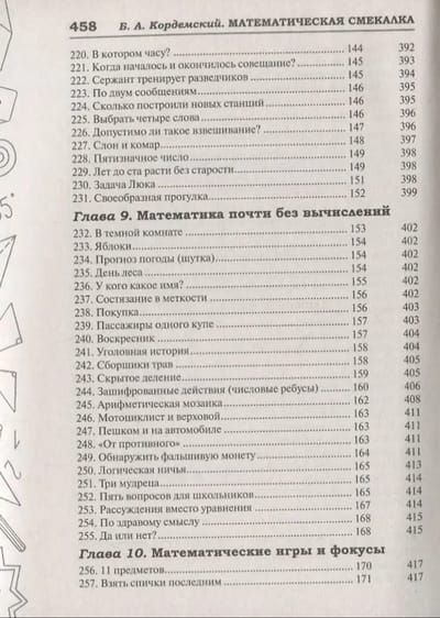 Книга мэтра отечественной научно-популярной литературы Бориса Анастасьевича Кордемского — сборник математических миниатюр: разнообразных занимательных задач, математических игр, головоломок, шуток и фокусов. Она неоднократно выходила как в нашей стране, так и за рубежом. В течение многих лет была и остается настольной книгой многих поколений преподавателей и учащихся. Все, кто увлекается математикой, — независимо от возраста — получат возможность потренировать мышление, находчивость и изобретательность. В конце книги приводятся ответы и подробные решения ко всем задачам.