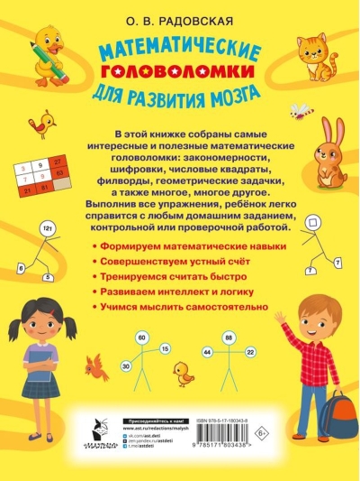 В сборнике «Математические головоломки для развития мозга» — только полезные задания для учеников начальной школы: закономерности, шифровки, числовые квадраты, филворды, геометрические задачи, а также многое другое. Решая головоломки на регулярной основе, школьники смогут развить математические способности и подготовиться к контрольным и проверочным работам. Книгу можно использовать для занятий дома и в классе по всем федеральным программам начальной школы.