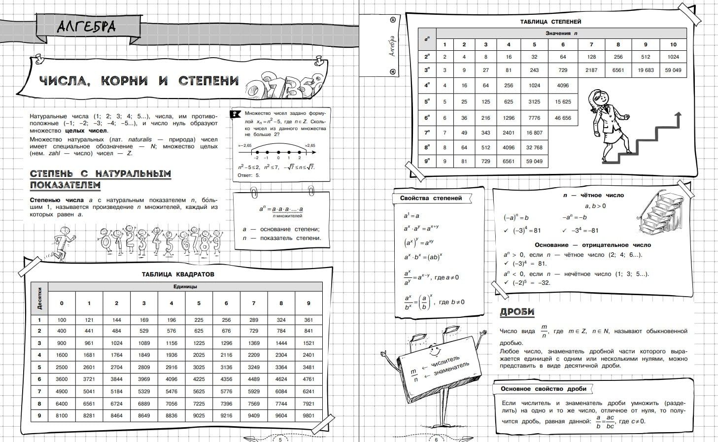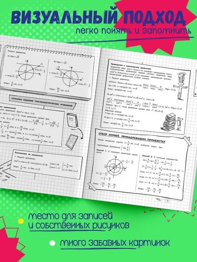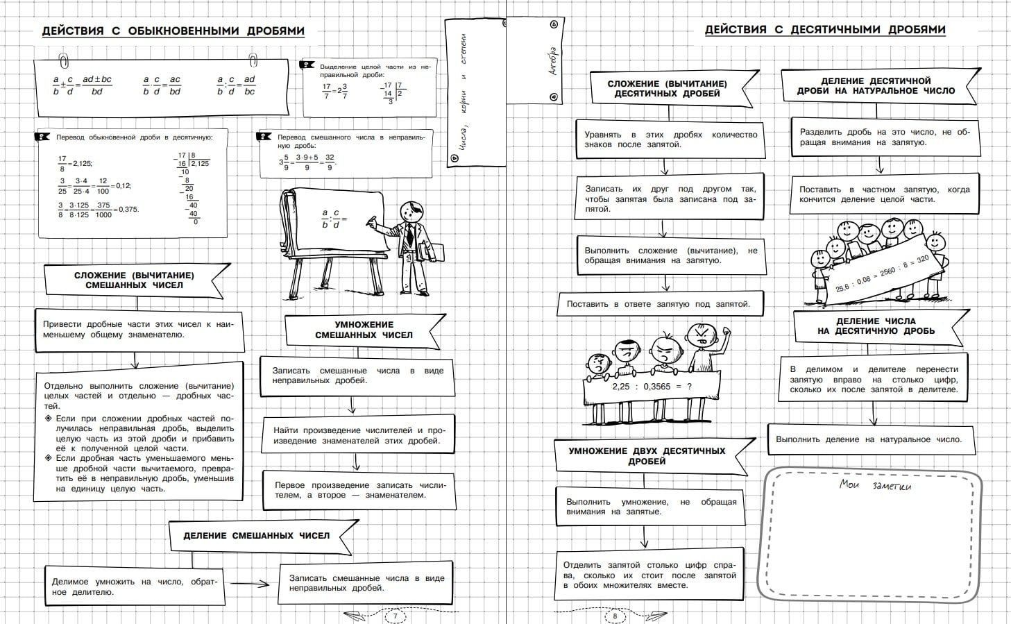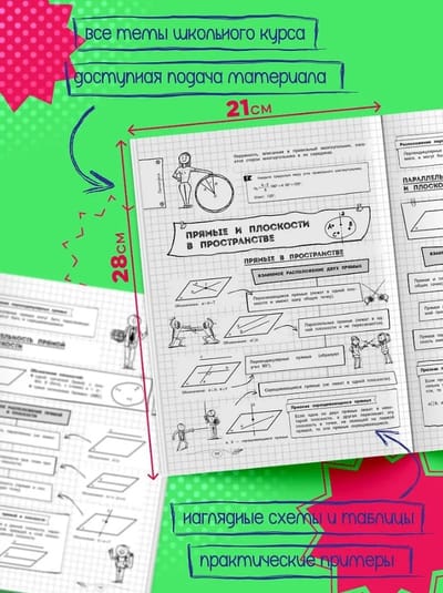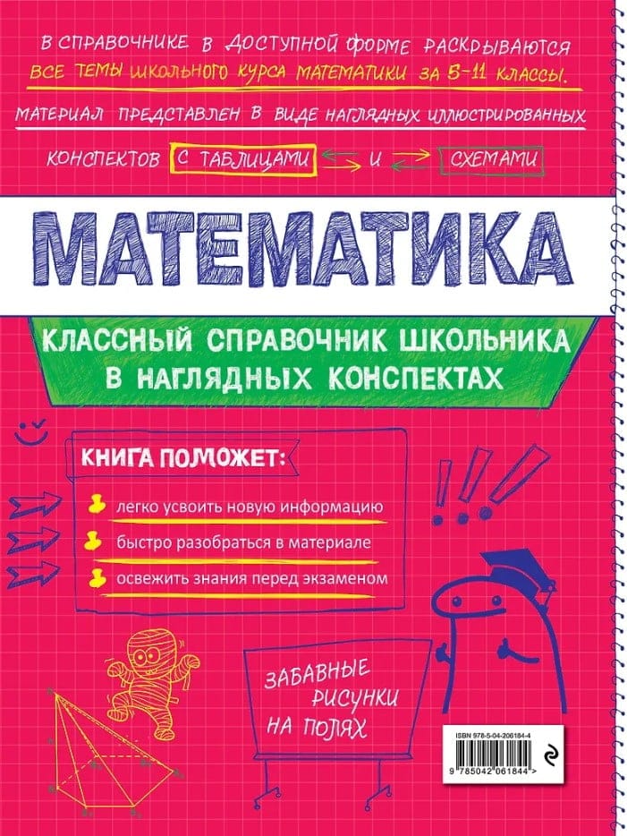 Справочник по математике в наглядных конспектах для учеников 5-11 классов превращает изучение каждой темы в увлекательное и познавательное приключение! Книга поможет запоминать и повторять материал на протяжении всего школьного курса. Благодаря наглядной подаче теории с примерами, схемами, а также забавными рисунками, текст становится доступным и интересным. Визуальный подход обеспечивает легкость восприятия и запоминания информации, ведь она оформлена в виде конспектов, словно ученик писал их сам. Всевозможные иллюстрации и места для собственных примеров и примечаний помогут сделать процесс обучения максимально простым и приятным! А при желании можно взять маркеры и сделать свой конспект еще более уникальным и персонализированным!