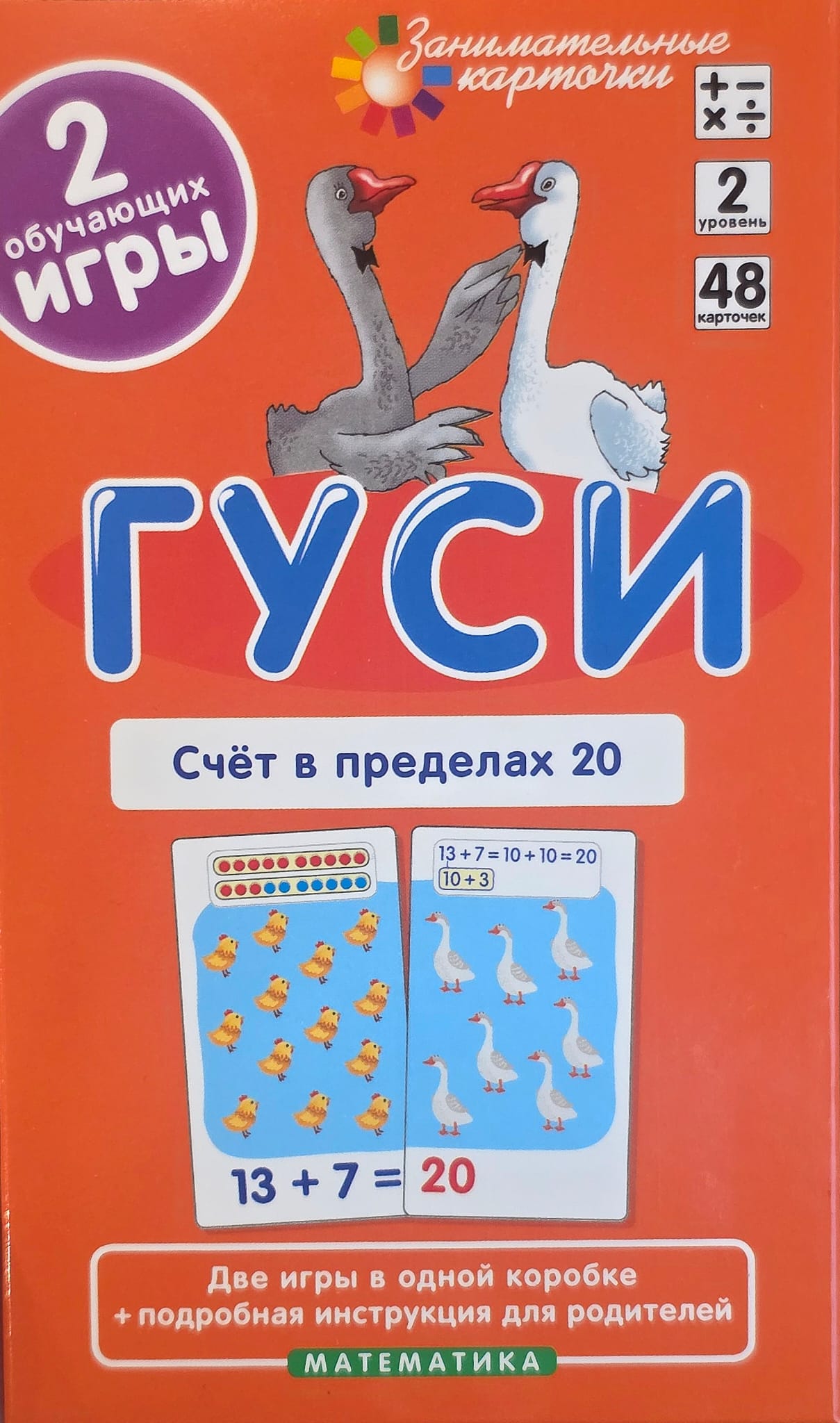 Набор карточек, который поможет научить ребёнка складывать, вычитать и сравнивать числа в пределах 20. Играя, ребёнок решает простые задачи и осваивает вычислительные навыки. Задания созданы по специальной методике, которая не только помогает научиться считать, но и рождает у ребёнка интерес к математике, стремление использовать математические знания в повседневной жизни.