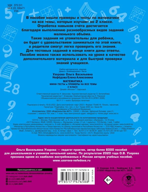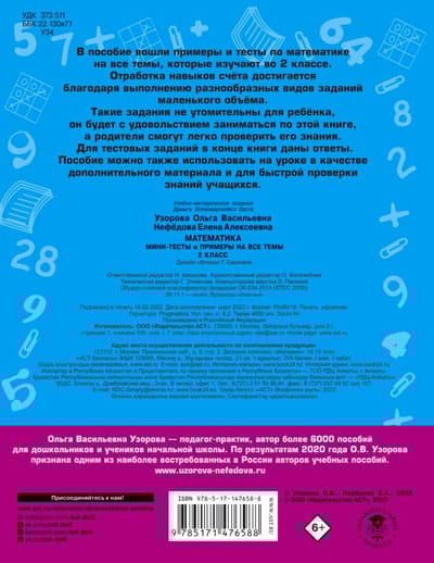 В пособие вошли примеры и тесты по математике на все темы, которые изучают во 2 классе. Отработка навыков счёта до автоматизма достигается благодаря выполнению разнообразных видов заданий маленького объёма. Такие задания не утомительны для ребёнка, он будет с удовольствием заниматься по этой книге, а родители смогут легко проверить его знания. Для тестовых заданий в конце книги даны ответы. Пособие можно также использовать на уроке в качестве дополнительного материала и для быстрой проверки знаний учащихся. Для младшего школьного возраста.
