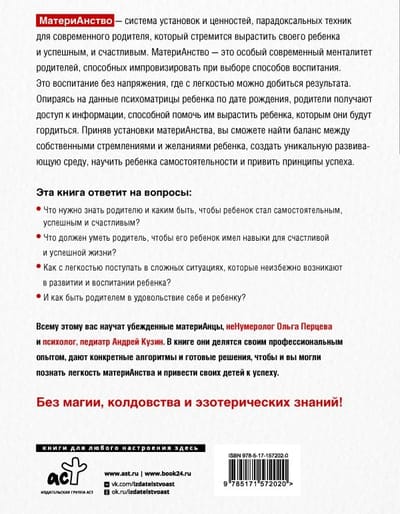МатериАнство — система установок и ценностей, парадоксальных техник для современного родителя, который стремится вырастить своего ребенка и успешным, и счастливым.МатериАнство — это особый современный менталитет родителей, способных импровизировать при выборе способов воспитания. Это воспитание без напряжения, где с легкостью можно добиться результата.Опираясь на данные психоматрицы ребенка по дате рождения, родители получают доступ к информации, способной помочь им вырастить ребенка, которым они будут гордиться. Приняв установки материАнства, вы сможете найти баланс между собственными стремлениями и желаниями ребенка, создать уникальную развивающую среду, научить ребенка самостоятельности и привить принципы успеха.