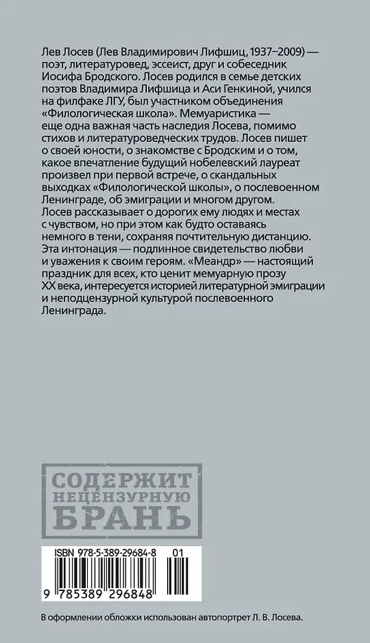 Лев Лосев (Лев Владимирович Лифшиц, 1937–2009) — поэт, литературовед, эссеист, друг и собеседник Иосифа Бродского. Лосев родился в семье детских поэтов Владимира Лифшица и Аси Генкиной, учился на филфаке ЛГУ, был участником объединения «Филологическая школа».